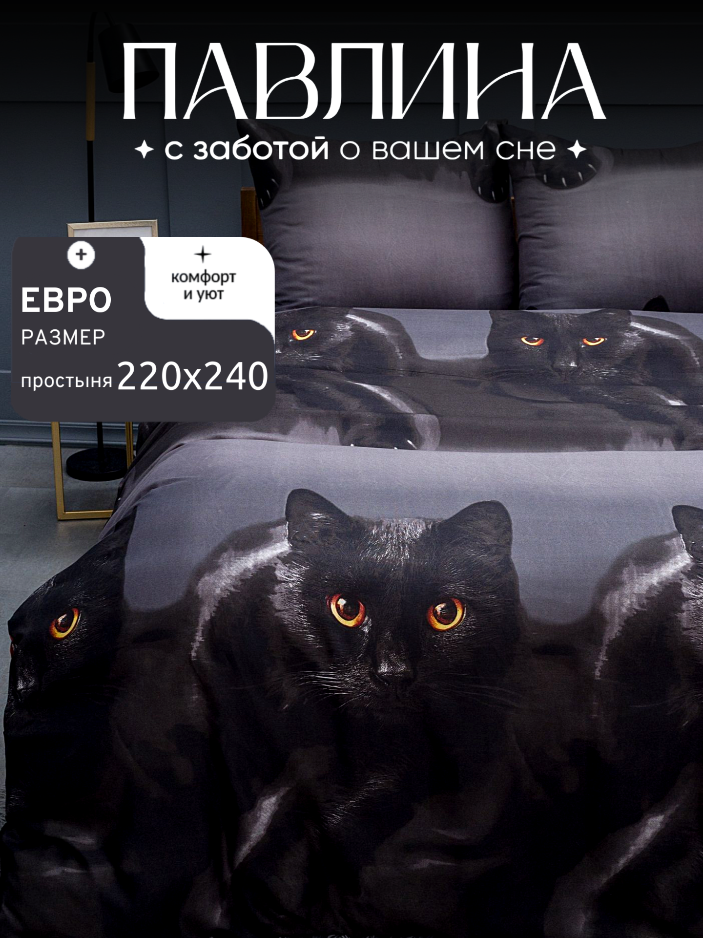 Постельное белье 2 спальное с европростыней Павлина Черный котик, Полисатин, наволочки 70x70