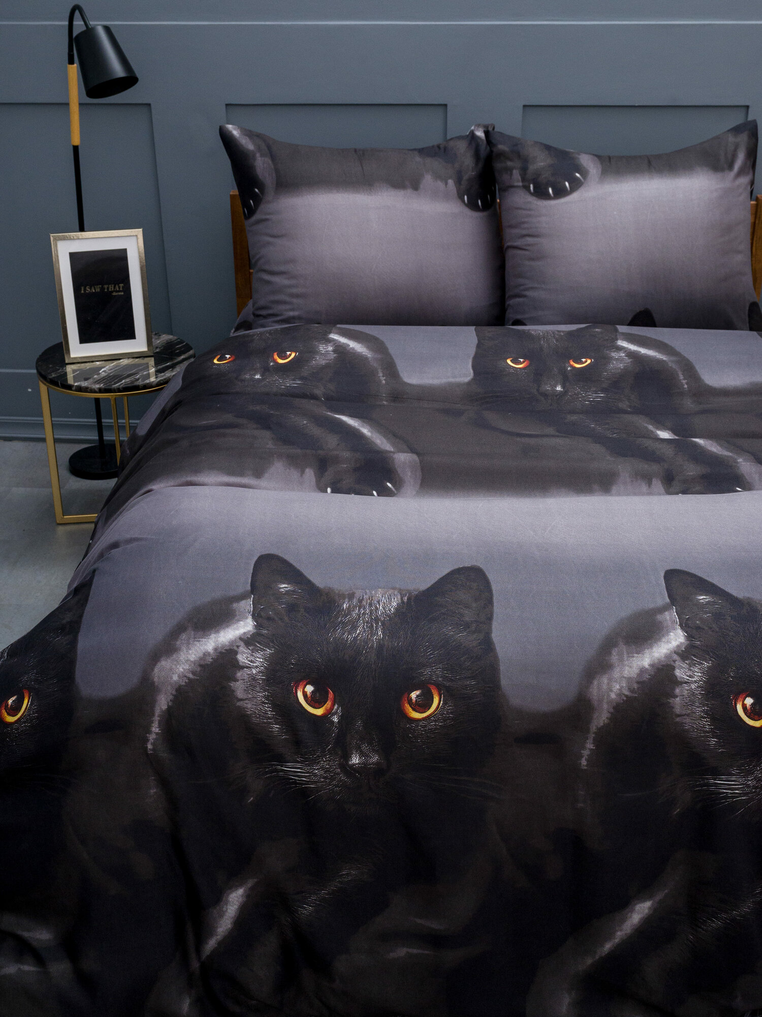 Постельное белье 2 спальное с европростыней Павлина Черный котик, Полисатин, наволочки 70x70