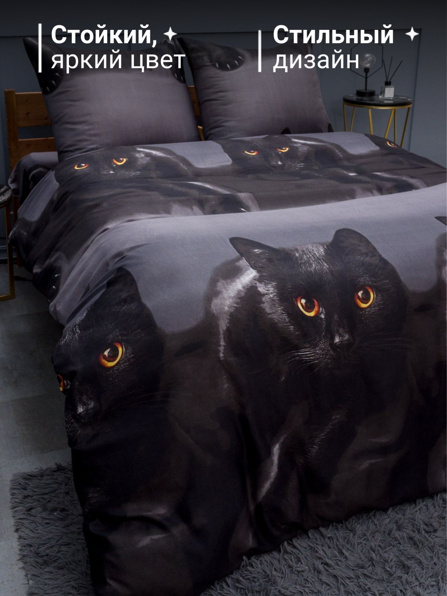Купить Постельное белье 2 спальное с европростыней Павлина Черный котик, Полисатин, наволочки 70x70