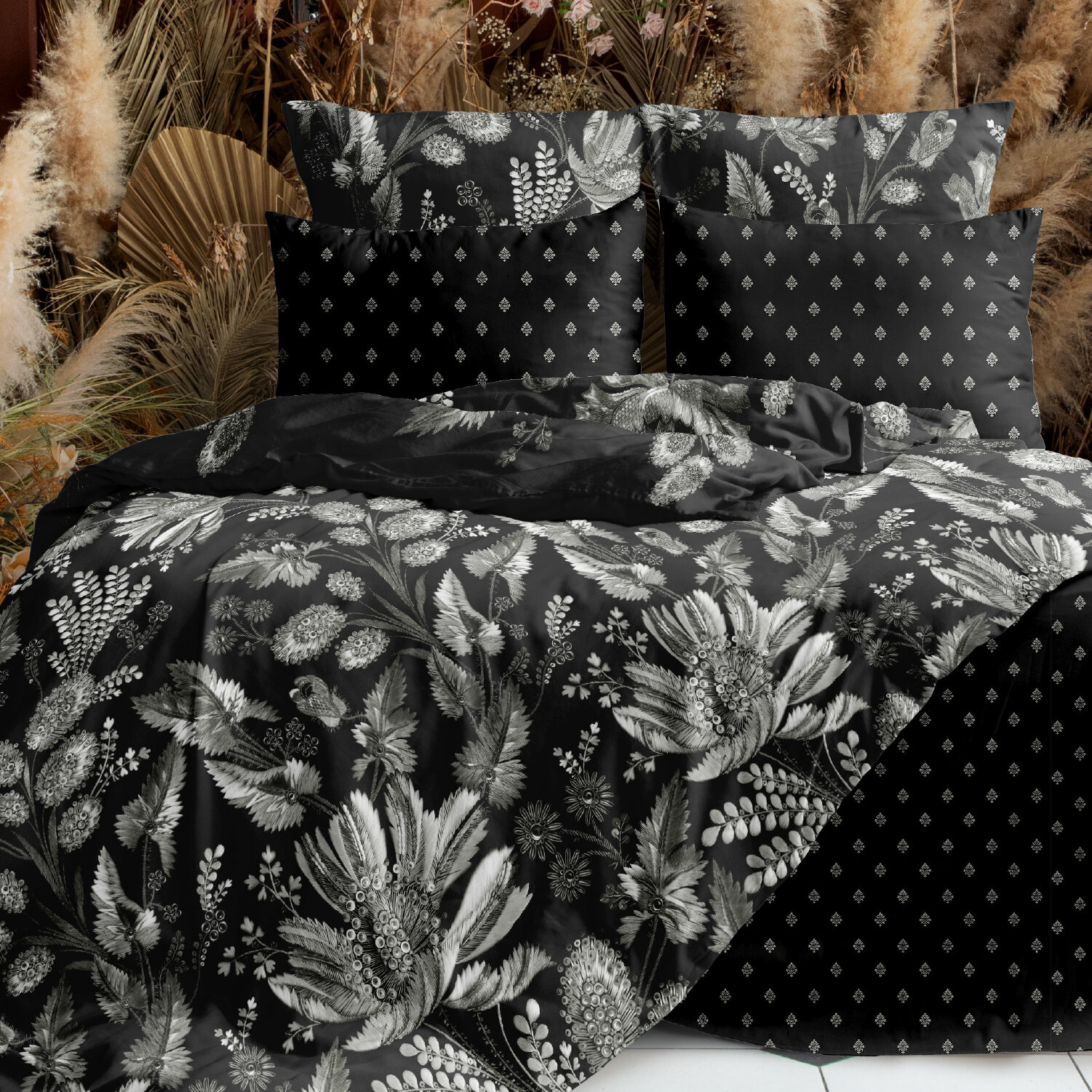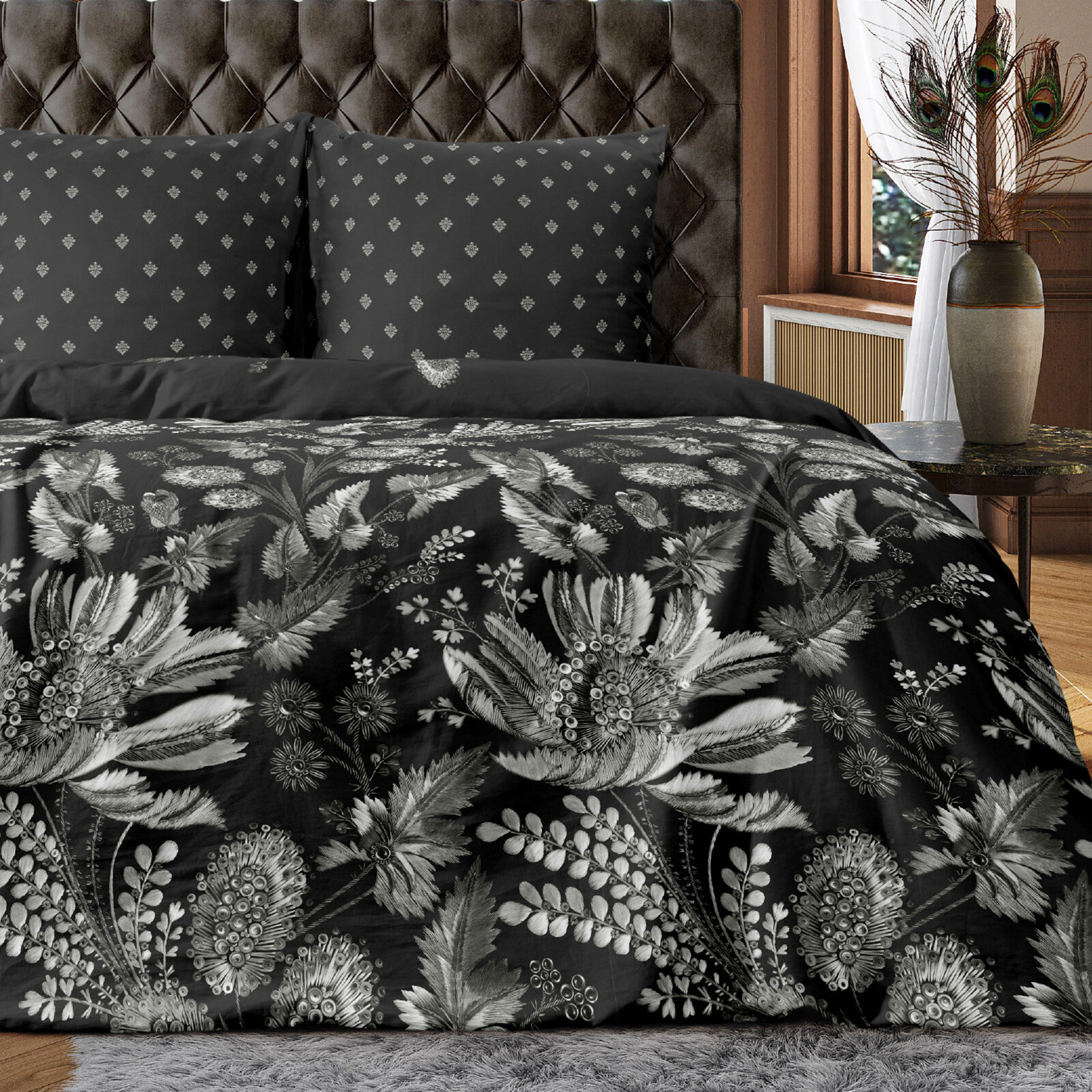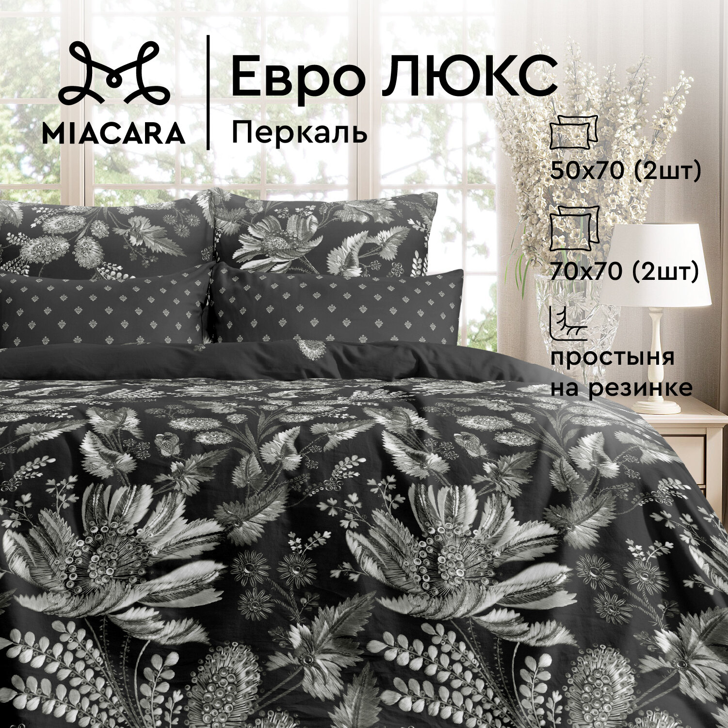 Постельное белье Евро Mia Cara, Перкаль, 4 нав. (50х70-2шт; 70х70-2шт), на резинке, Таинственный сад, темно-фиолетовый