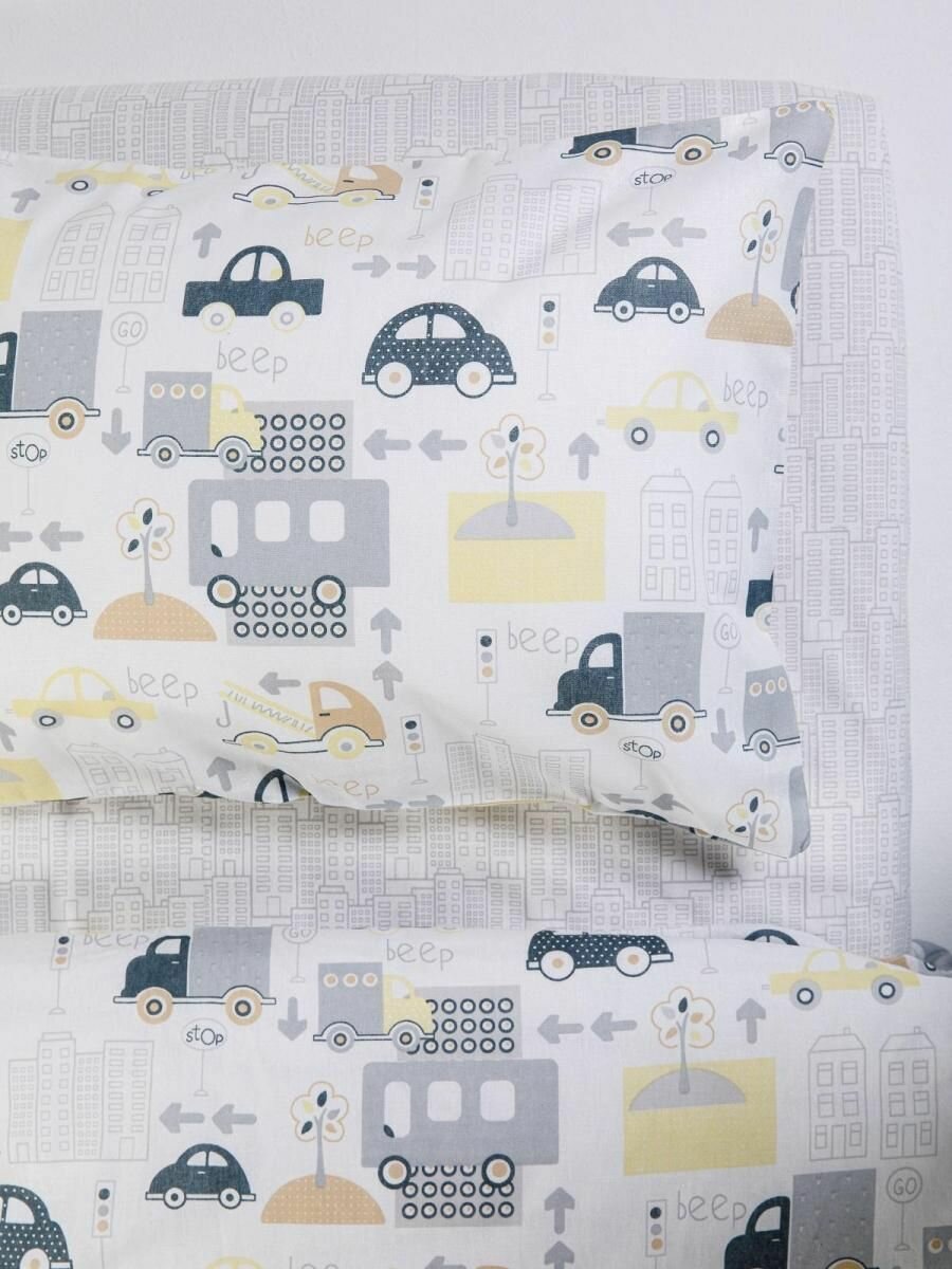 СохранитьПостельное белье Ясельное в кроватку, одна наволочка 40х60, простыня 110х140, пододеяльник 110х140, КПБ Детское, Бязь, "Трафик" 10356-1+10357-1 интересное: