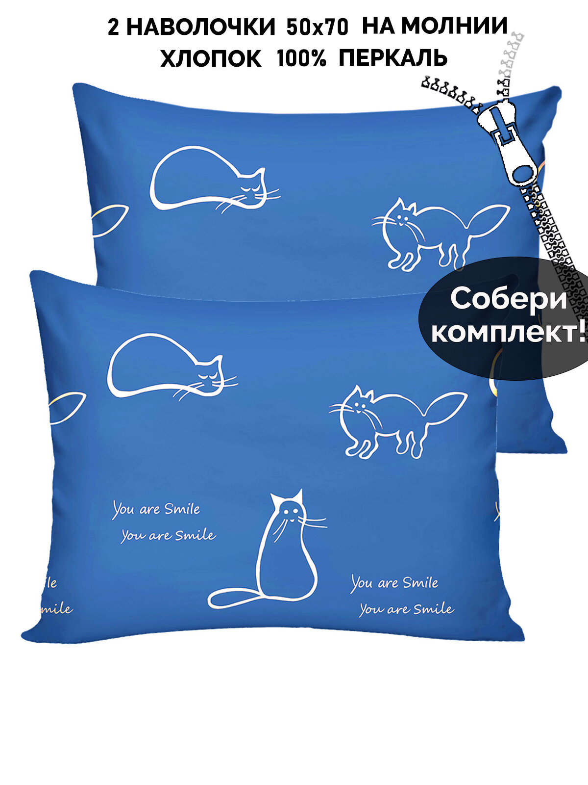 Наволочка 2шт на молнии 50х70 см Сказка "Котики", ткань перкаль, 100% хлопок