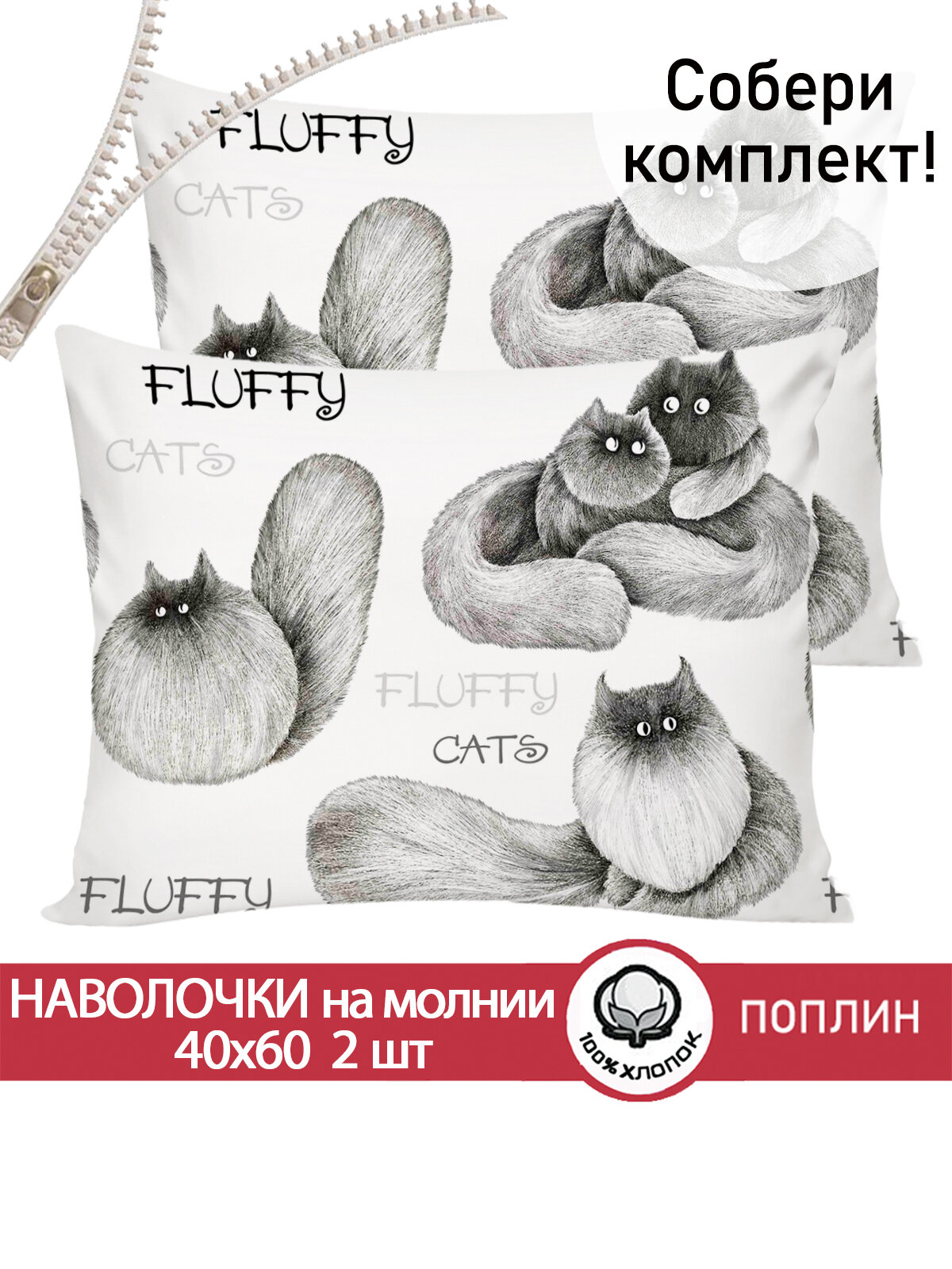 Наволочка 2шт на молнии 40х60 см Сказка "Котики", ткань перкаль, 100% хлопок