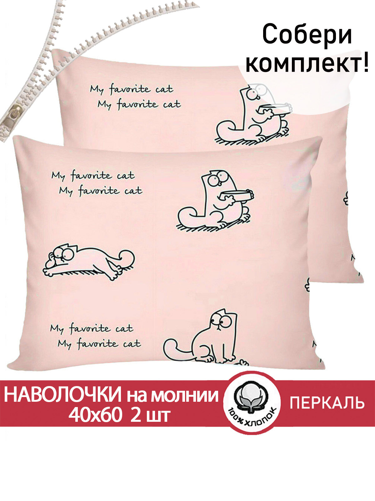 Наволочка 2шт на молнии Cказка "Котики (беж)" 40х40 см, ткань перкаль, 100% хлопок