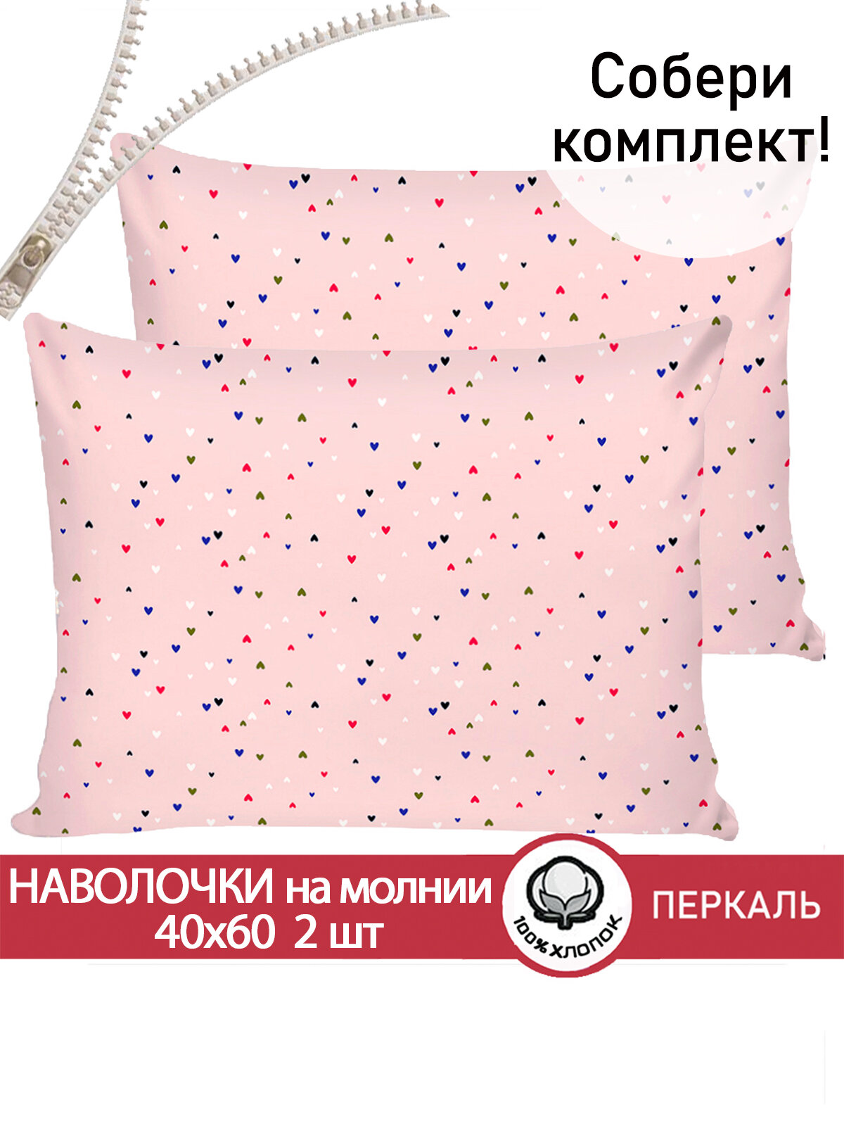 Купить Наволочка 2шт на молнии 40х60 см Сказка "Сердечки", ткань перкаль, 100% хлопок