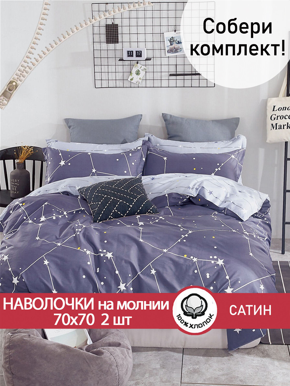 Наволочка 2шт на молнии 70х70 см Сказка Сатин "Созвездие", ткань сатин, 100% хлопок интересное: