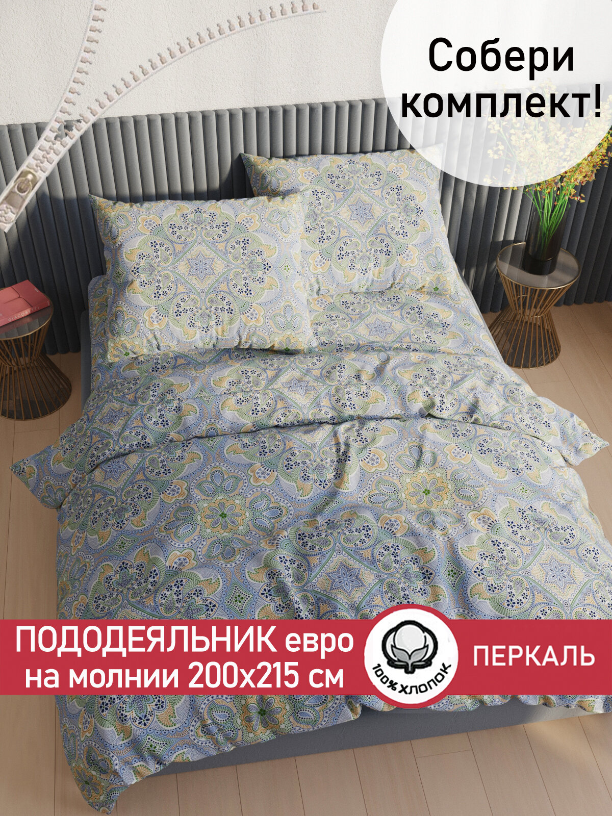 Пододеяльник 200х215 см на молнии, евро, Сказка "Бисер", ткань перкаль, 100% хлопок интересное: