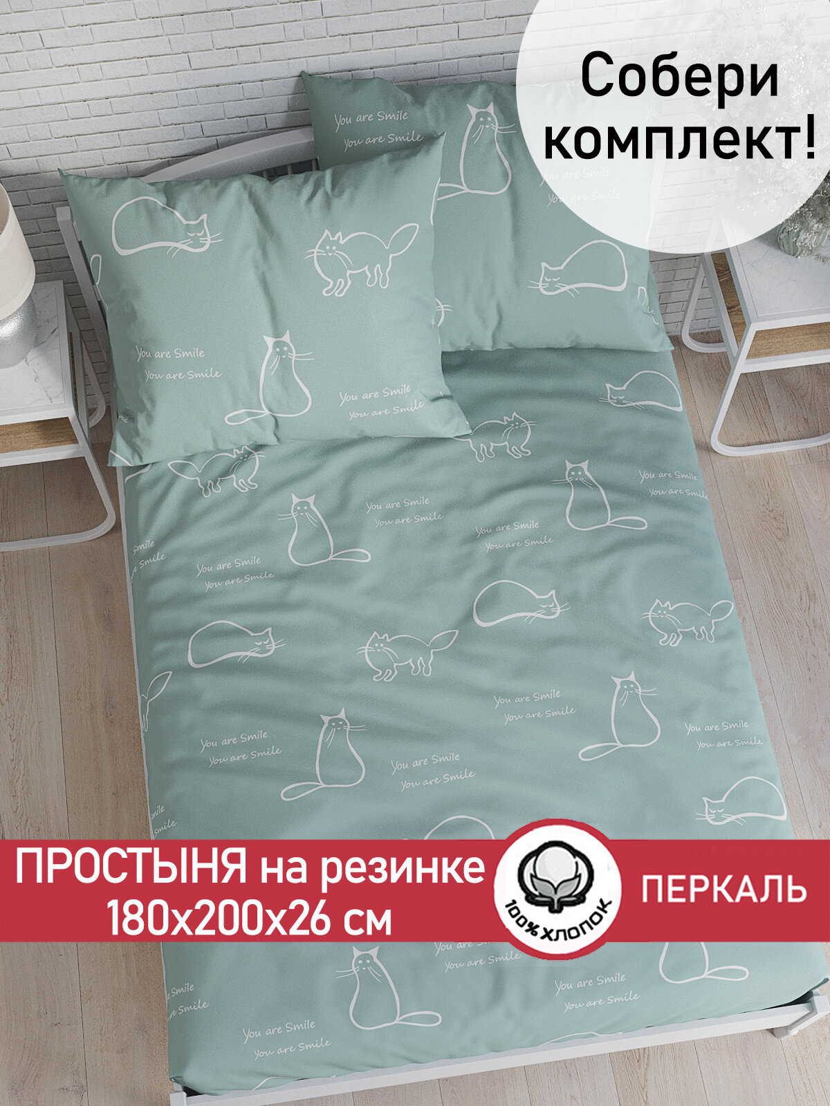 Купить Простынь на резинке Сказка "Котики (мята)" 180х200 см, ткань перкаль, 100% хлопок, высота 26 см