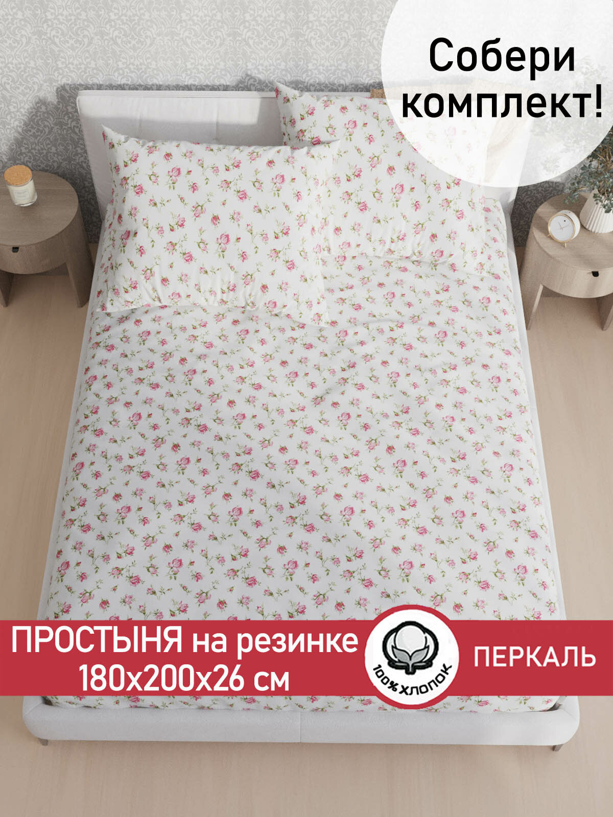 Купить Простынь на резинке Сказка "Розовые бутоны" 180х200 см, ткань перкаль, 100% хлопок, высота 26 см