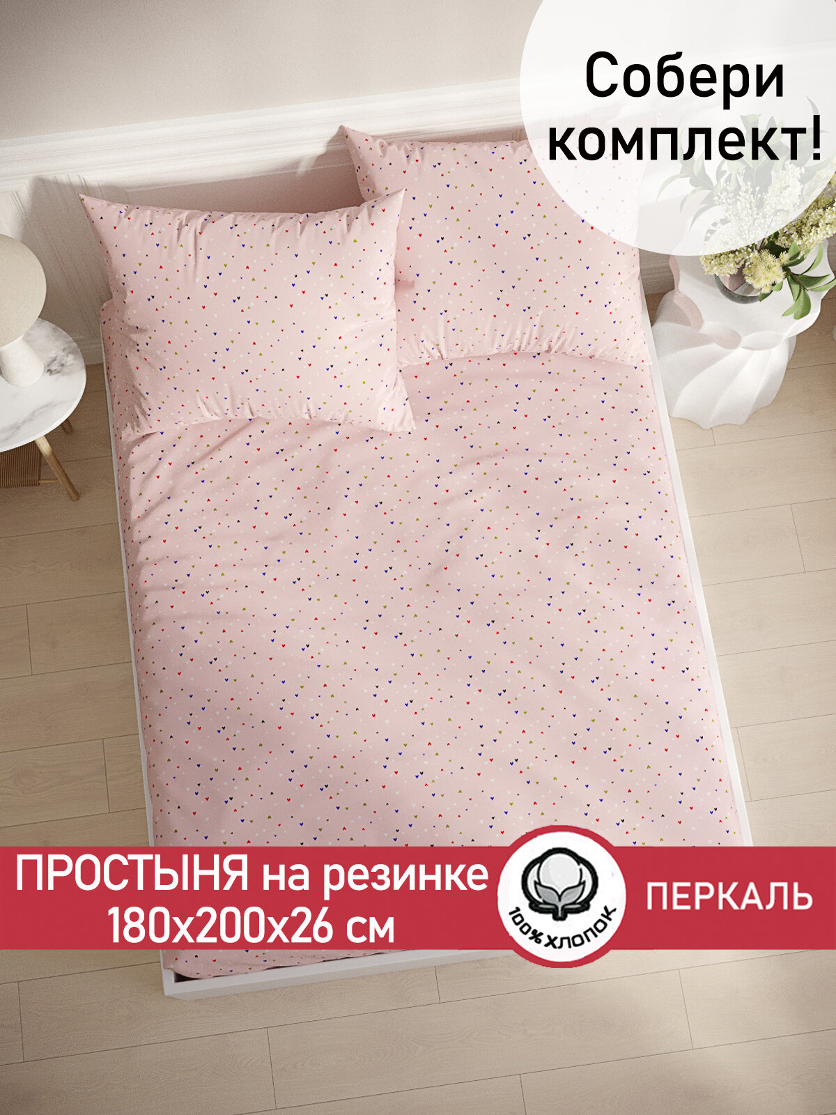 Простынь на резинке Сказка "Сердечки" 180х200 см, ткань перкаль, 100% хлопок, высота 26 см интересное: