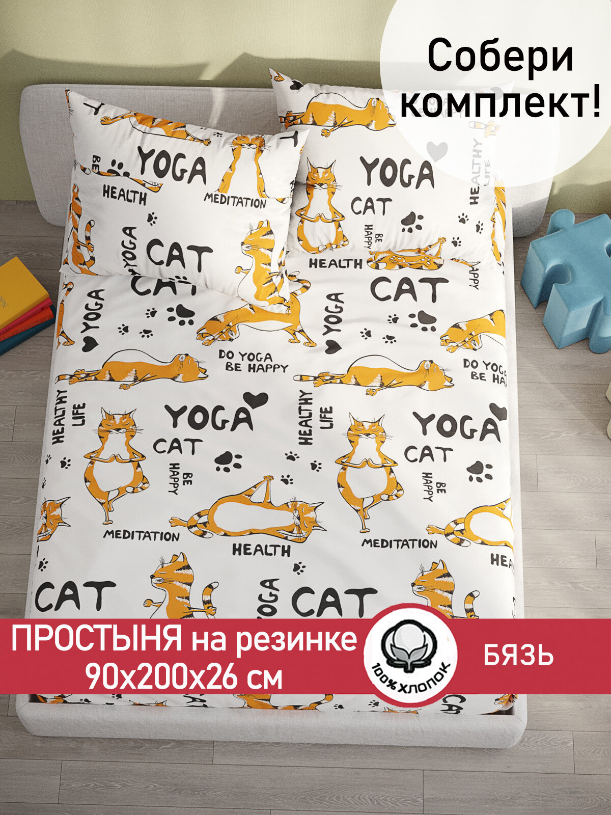 Простынь на резинке Сказка "Yogacat" 90х200 см, ткань бязь, 100% хлопок, высота 26 см интересное: