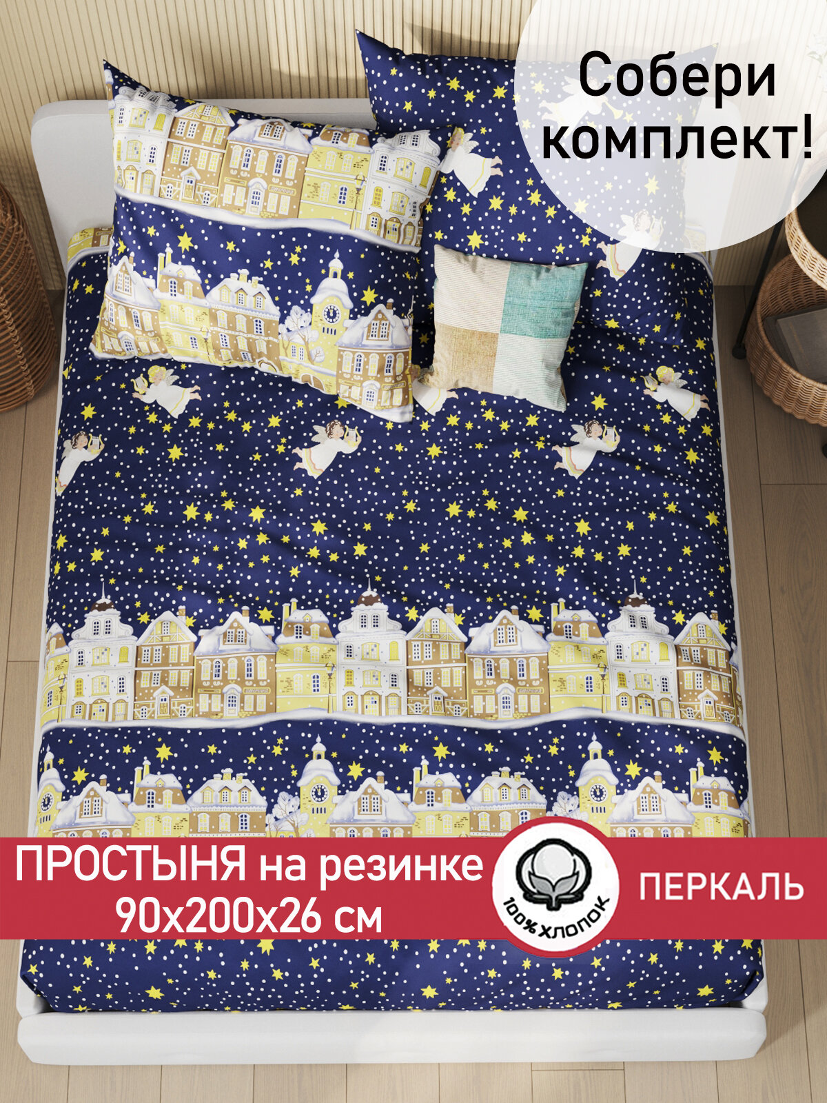 Простынь на резинке Сказка "Зимняя сказка" 90х200 см, ткань перкаль, 100% хлопок, высота 26 см интересное: