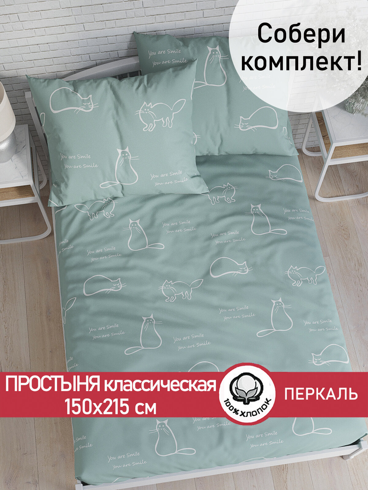 Простынь классическая Сказка "Котики (мята)" 150х215 см, ткань перкаль, 100% хлопок интересное: