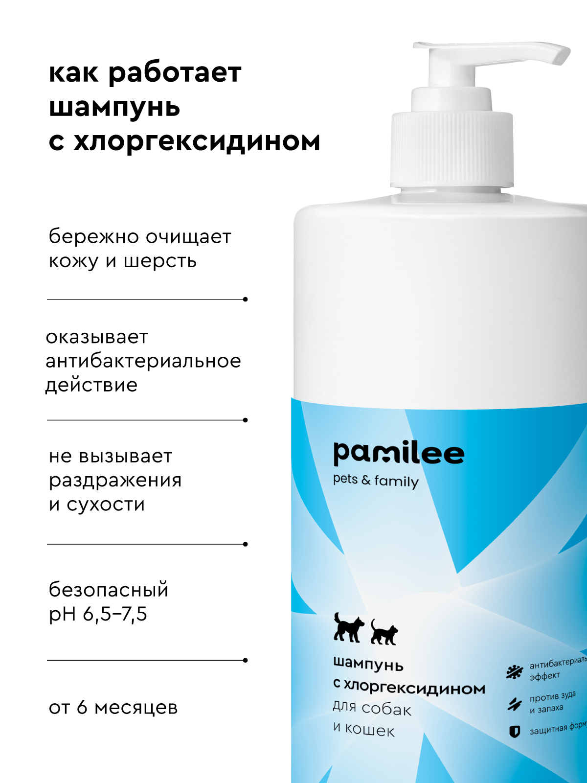 Шампунь для собак и кошек с хлоргексидином 2%, 1л, против зуда, гипоаллергенный, профессиональный, Pamilee