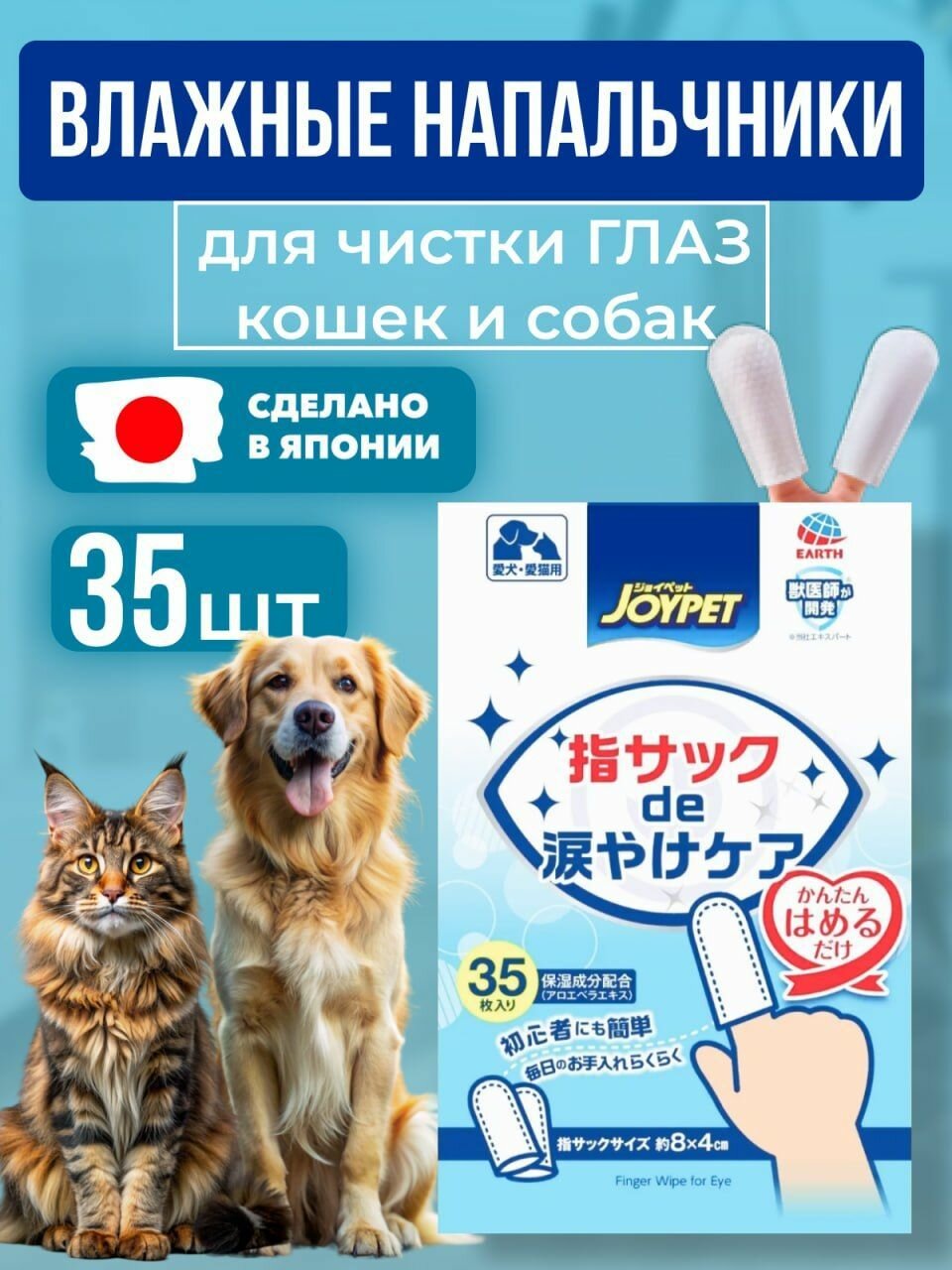Анатомическая влажная салфетка-напальчник Japan Premium Pet для ухода за ушами и профилактики отита у собак и кошек, 35 шт.