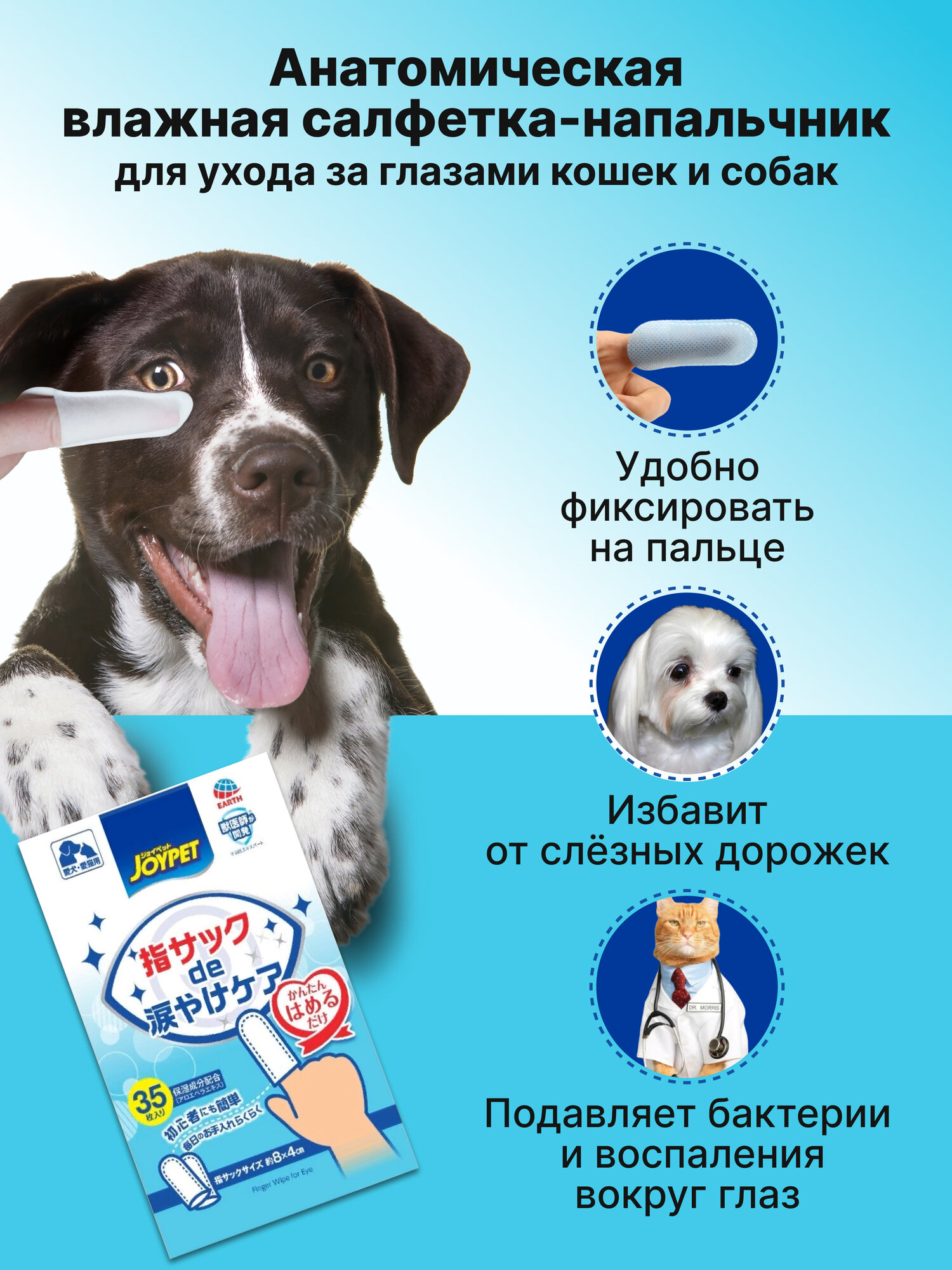 Купить Анатомическая влажная салфетка-напальчник Japan Premium Pet для устранения слёзных дорожек и ухода за глазами собак и кошек, 70 шт.
