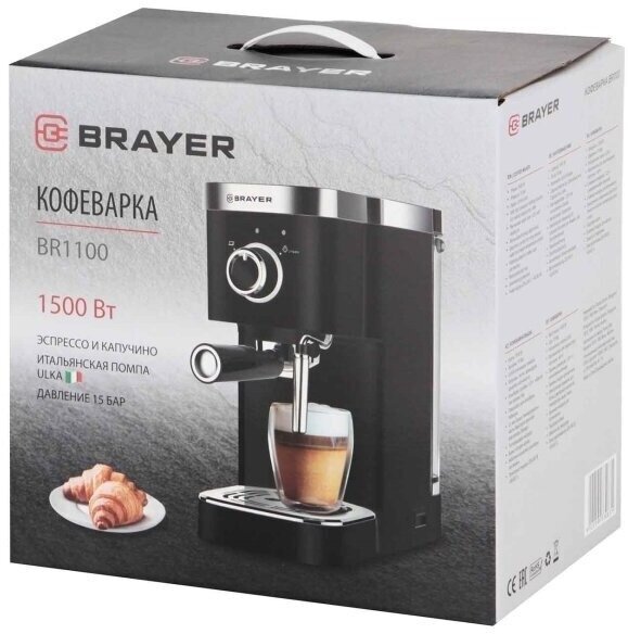 Brayer 1100BR Кофеварка рожковая , 1,25 л, 1500 Вт, 15 бар, Итальянская помпа, капучинатор, подогрев .