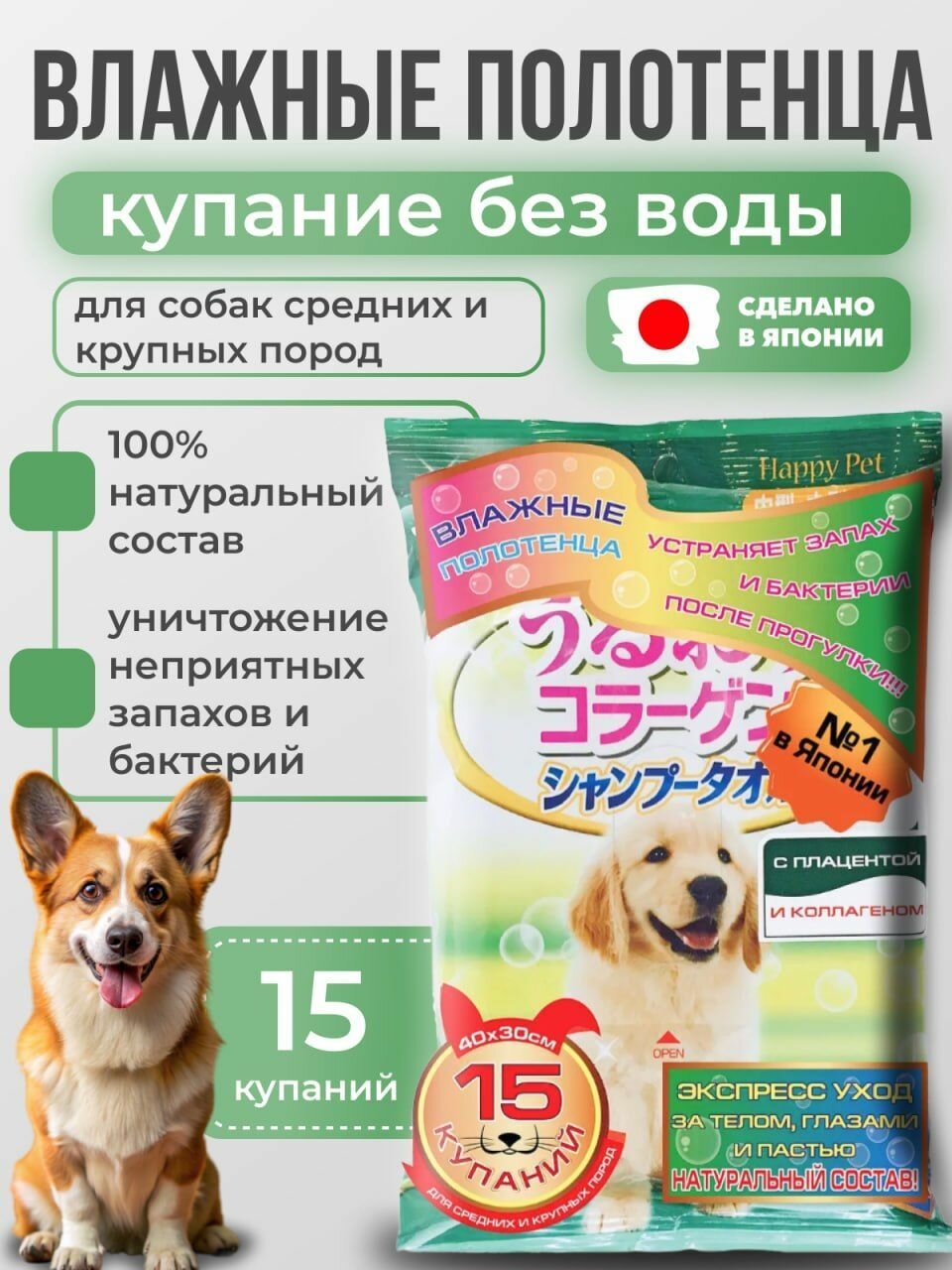 Шампуневые полотенца Japan Premium Pet экспресс-купание без воды с коллагеном и плацентой для крупных собак, 15 шт