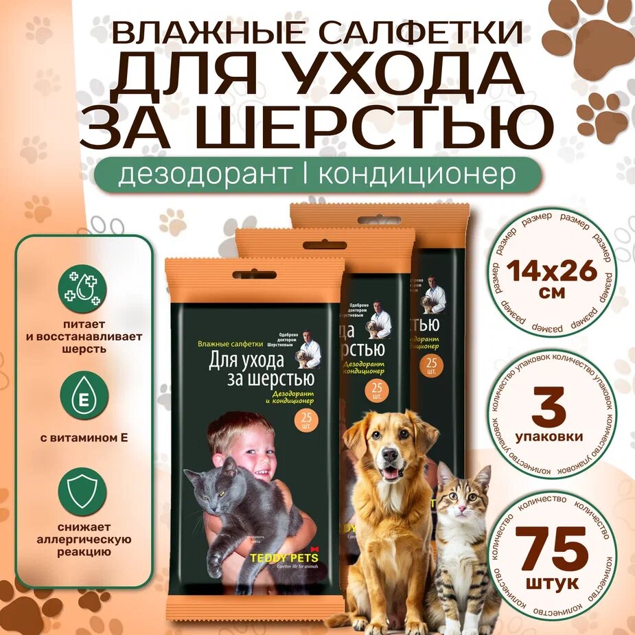 Купить Влажные салфетки для домашних животных Teddy pets, дезодорант кондиционер для собак и кошек 25 штук, 3 упаковки