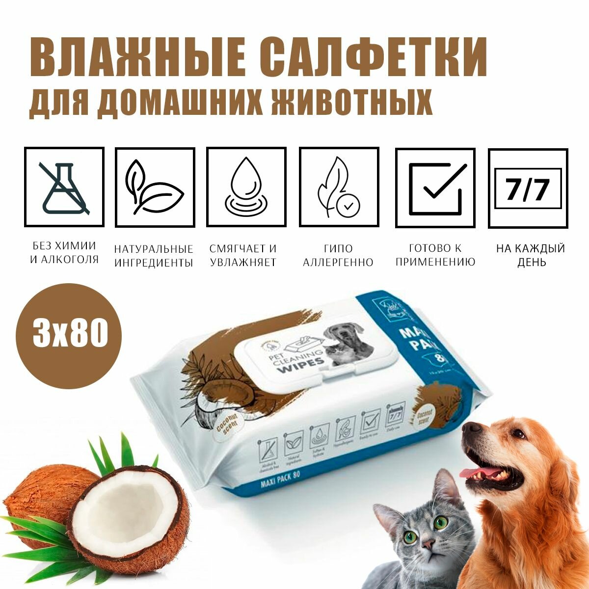Очищающие салфетки для животных M-PETS, аромат кокоса, 20x15 см, 3 упаковки по 80 шт. интересное: