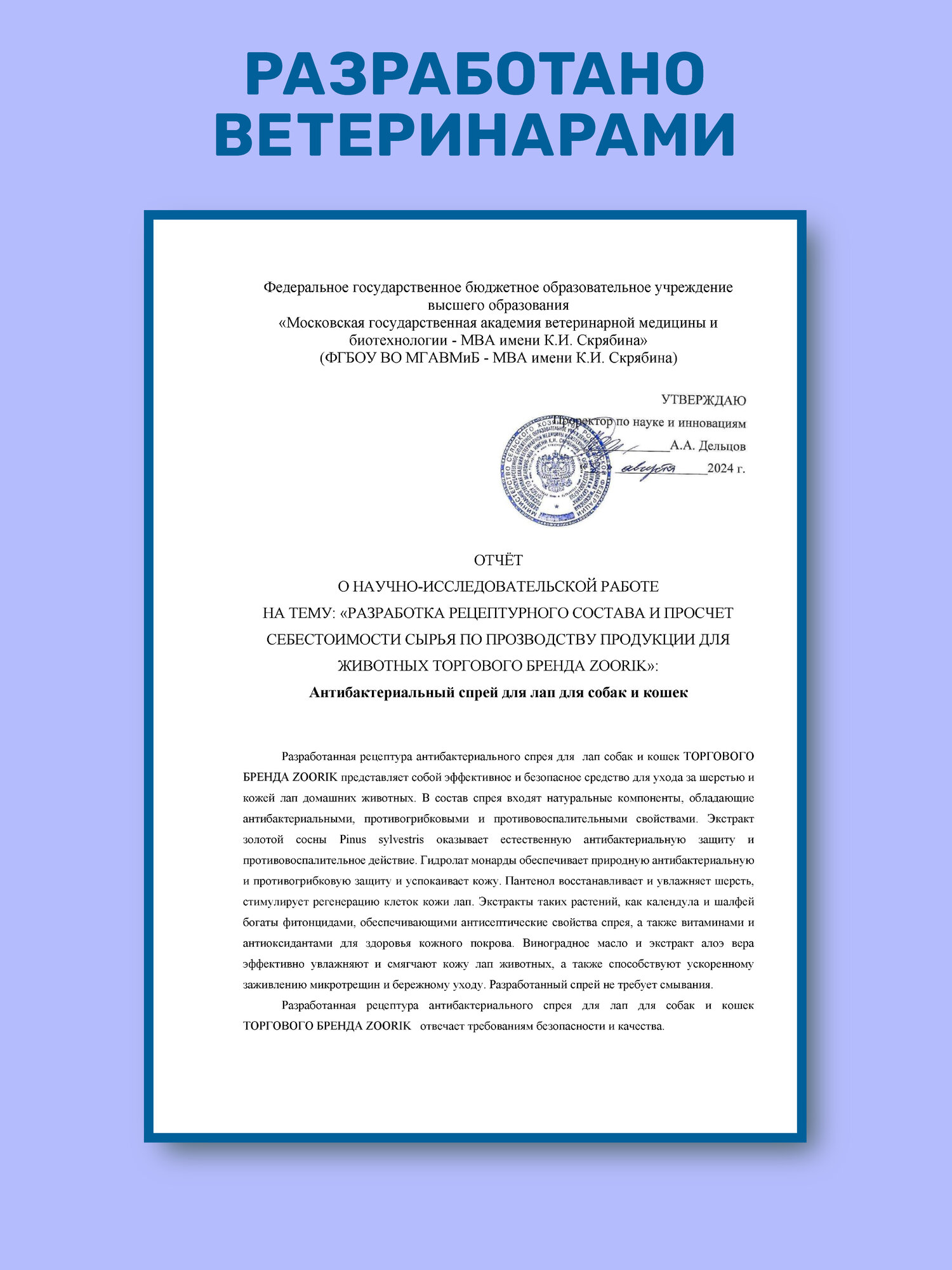 Спрей для лап / ZOORIK / Зурик / антибактериальный с хлоргексидином 250 мл