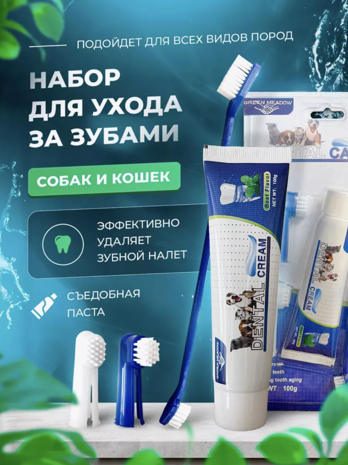 Набор для чистки, зубная паста щетка для собак, вкус говядина (100 мл.) + щетки интересное: