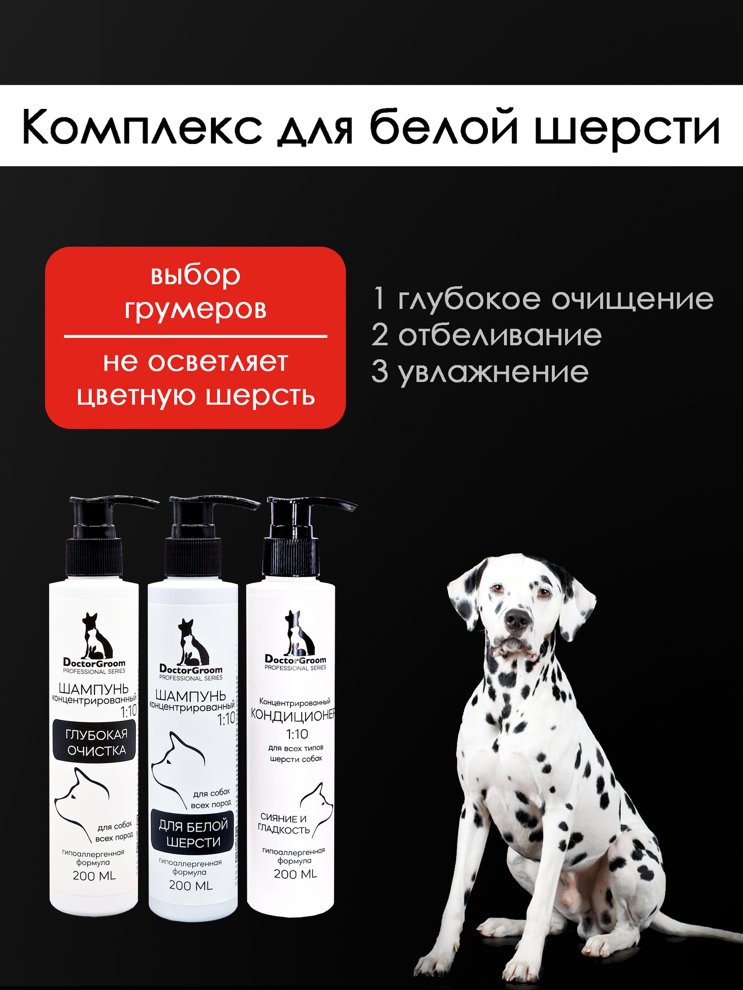 Купить Набор для ухода за белой шерстью и собак светлых окрасов Doctor Groom. Шампунь для глубокого очищения, шампунь для отбеливания, кондиционер для блеска и мягкости. 200 мл*3
