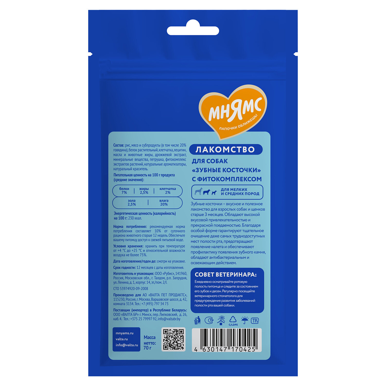 Лакомство Мнямс ДЕНТАЛ для собак Зубные спонжи с телятиной и фитокомплексом, 15 шт х 15 гр