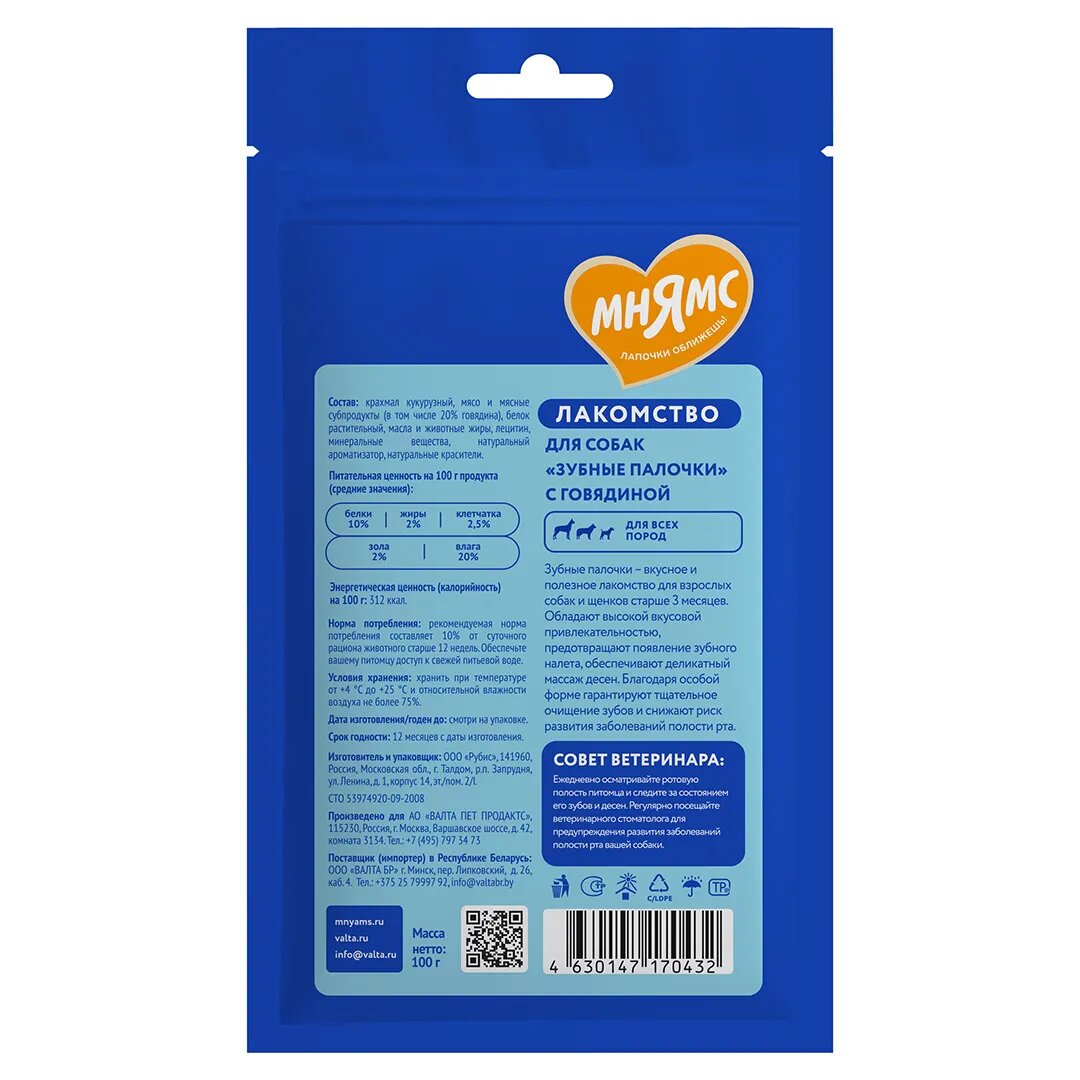 Лакомство Мнямс ДЕНТАЛ для собак Зубные спонжи с телятиной и фитокомплексом, 15 шт х 15 гр