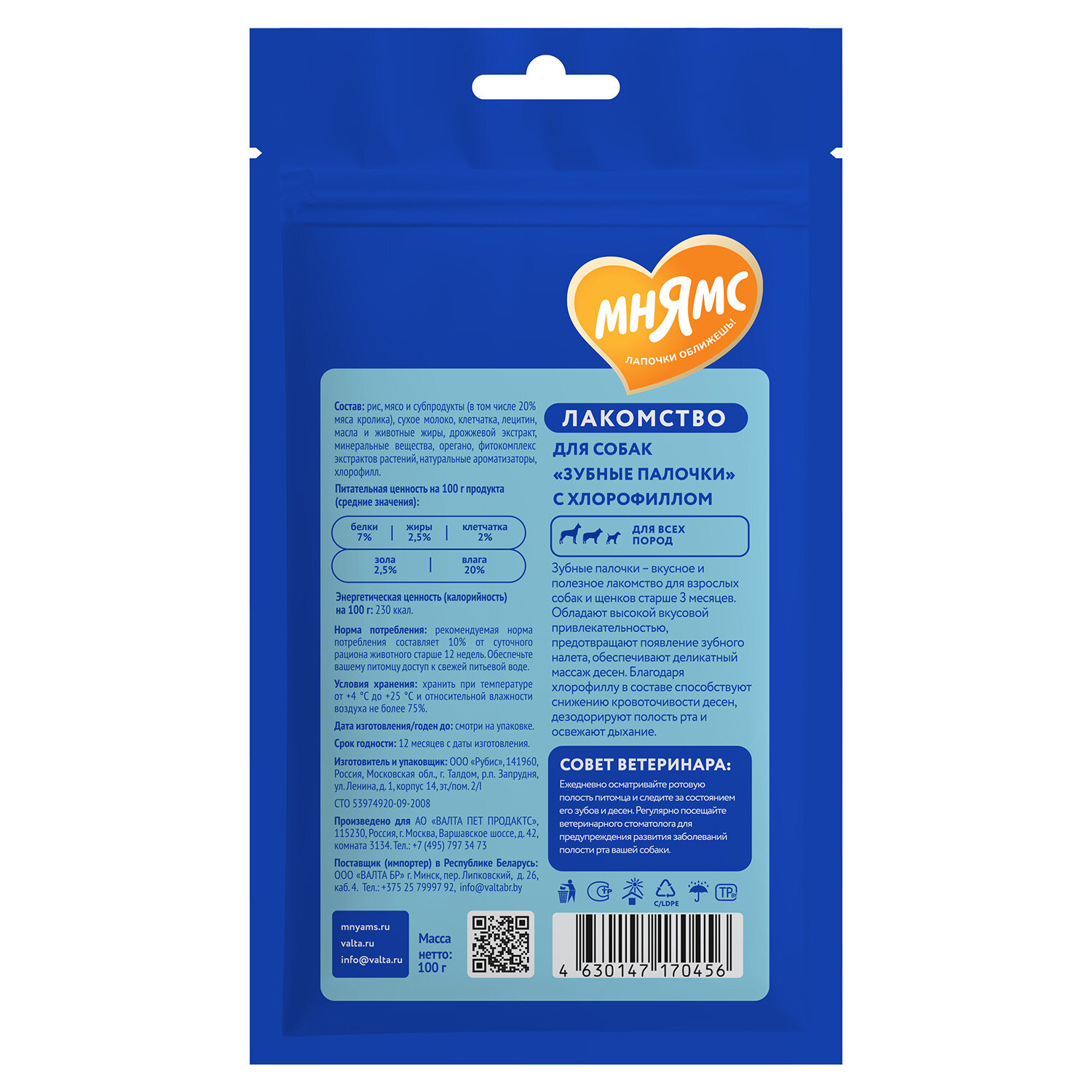 Лакомство Мнямс ДЕНТАЛ для собак Зубные палочки с хлорофиллом и кроликом, 4 шт х 100 гр