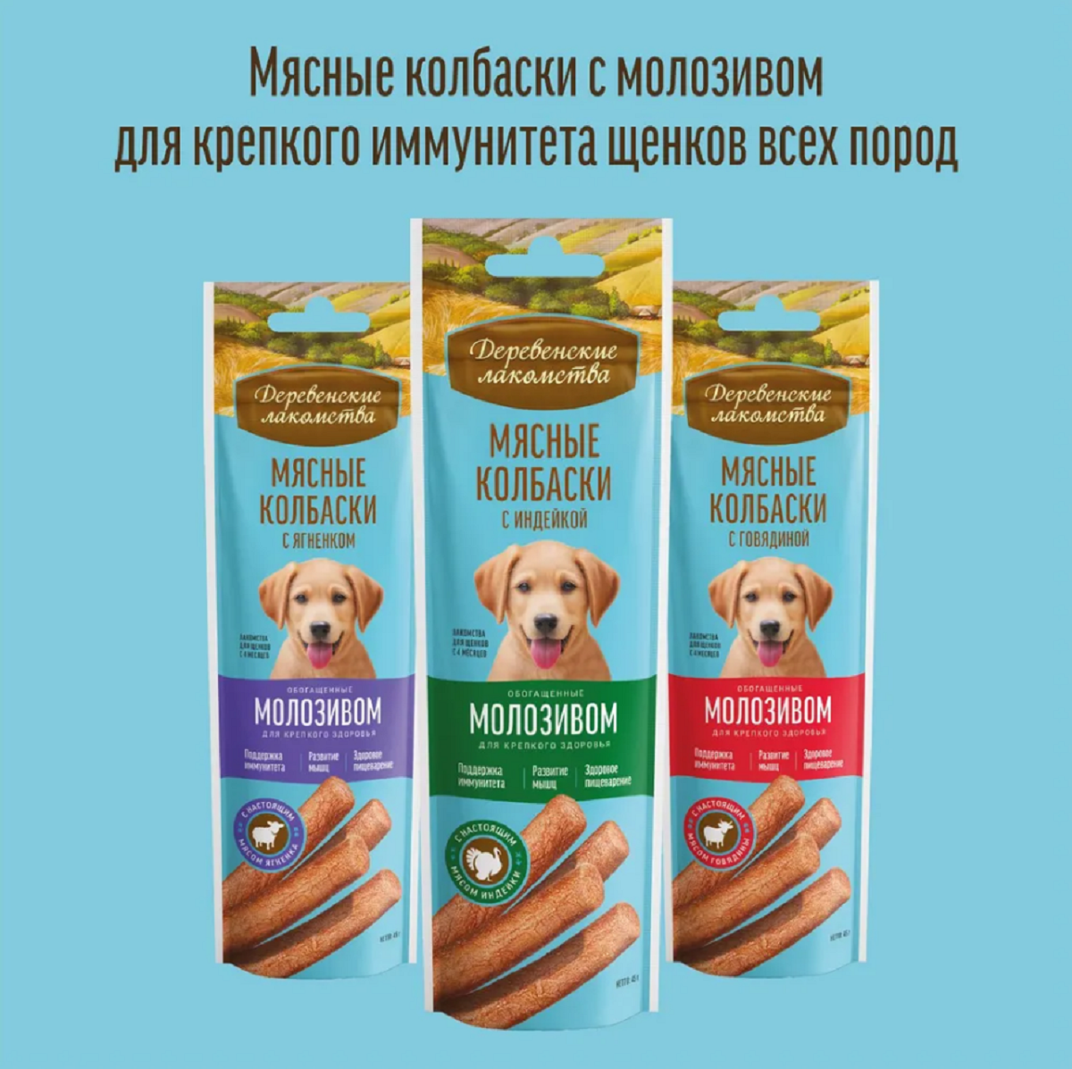 Купить Деревенские лакомства для щенков Мясные колбаски с индейкой и молозивом 45г (10 штук)