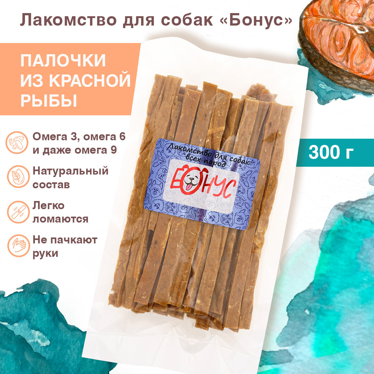 Лакомства для крупных , средних и мелких собак Бонус "Красная рыба - Лосось" 300 грамм интересное: