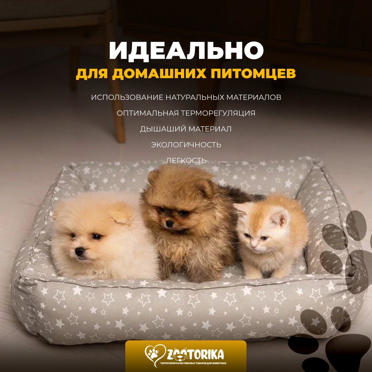 Лежанка для кошек и собак SunBed прямоугольная "Лапки", белая, 55х45 / Лежак для животных мелких и средних пород