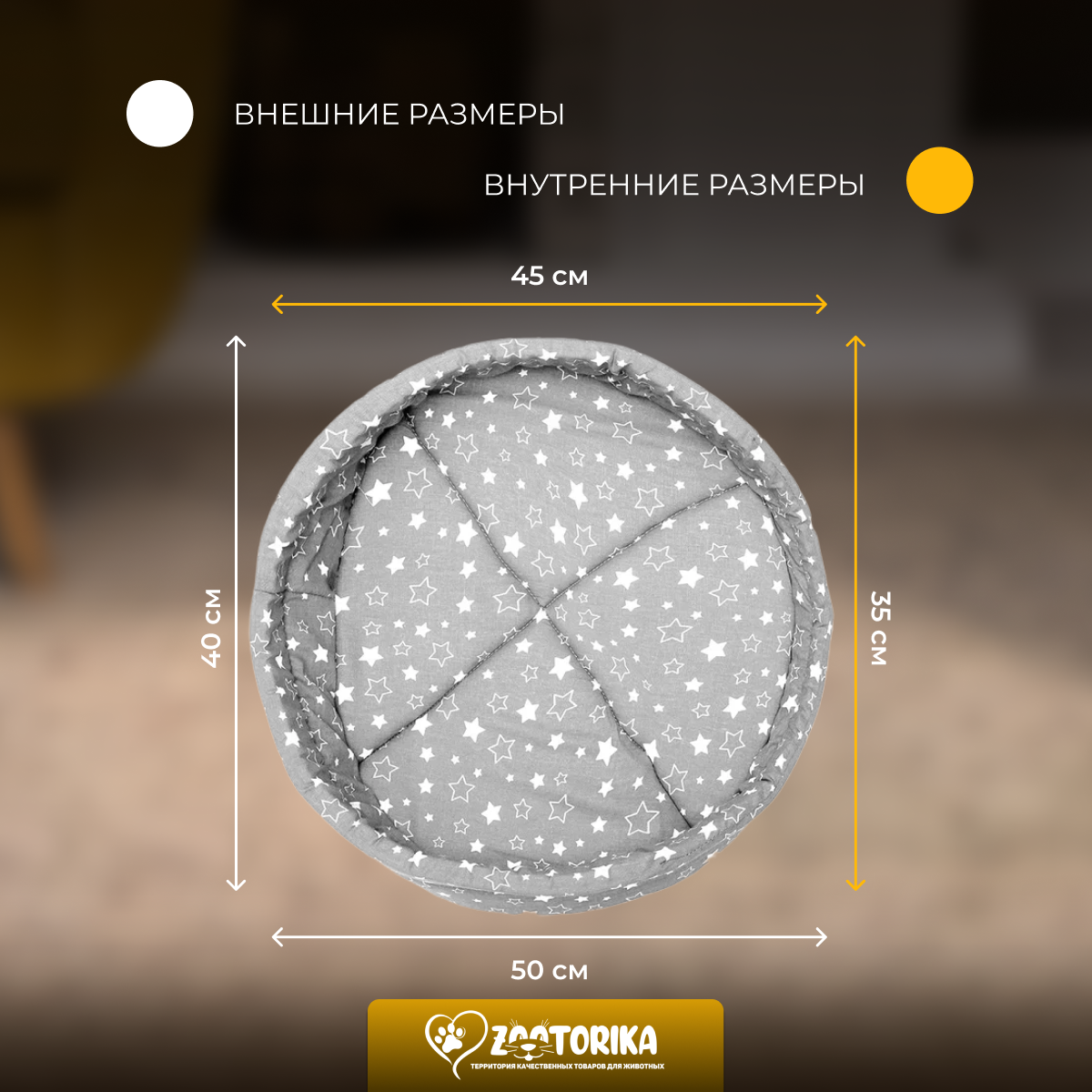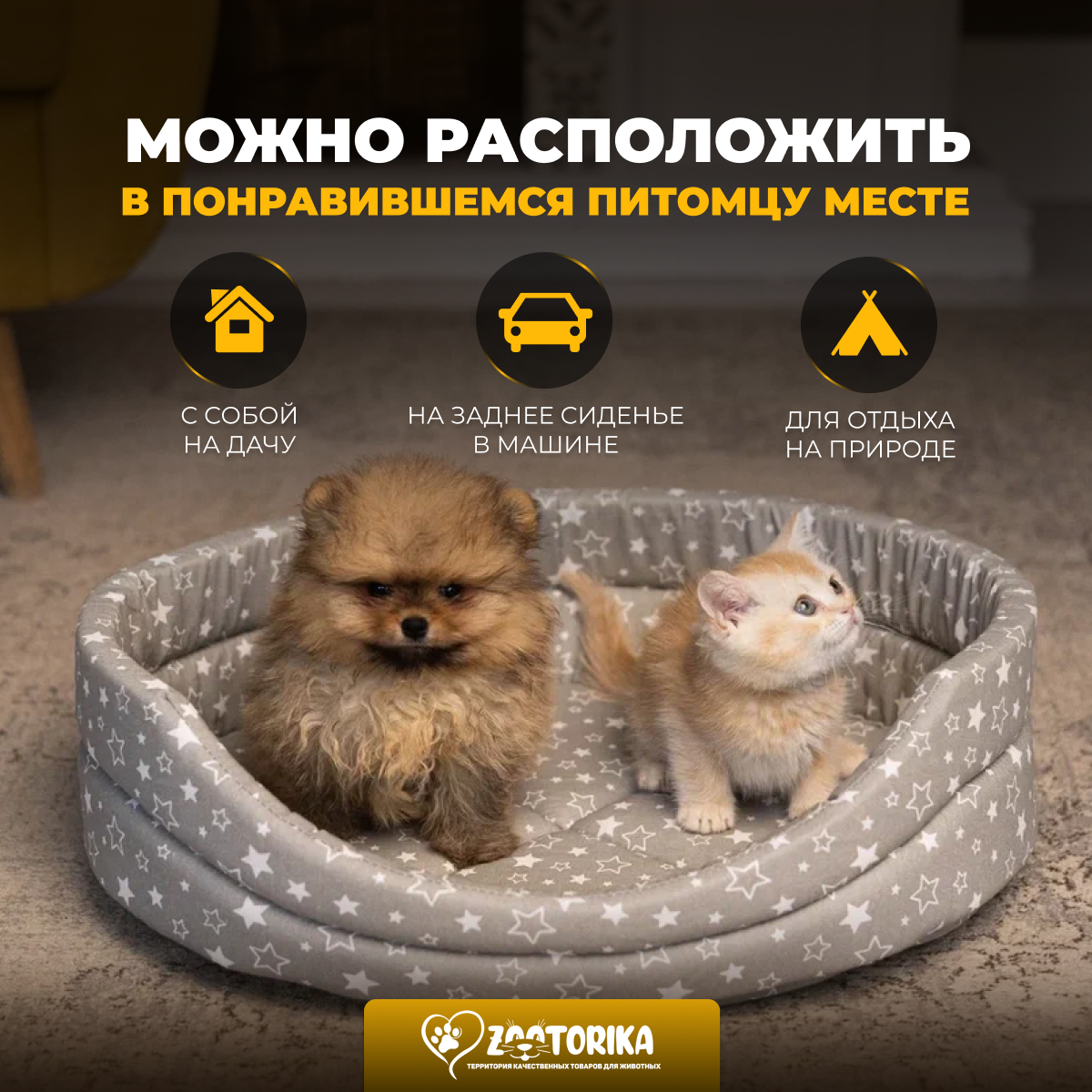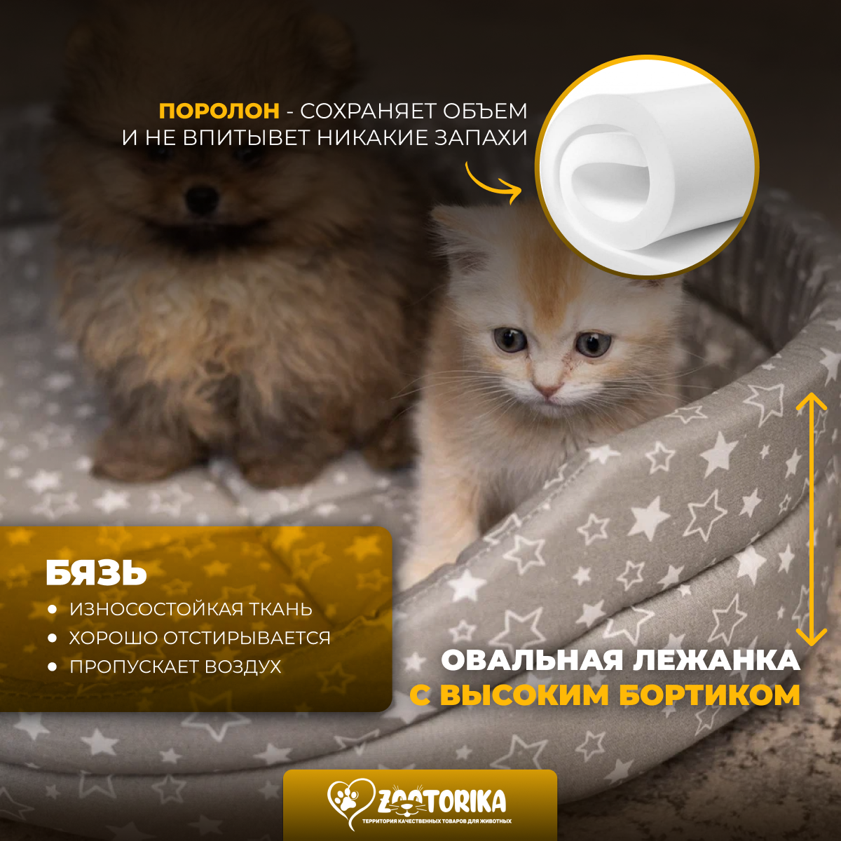 Лежанка для кошек и собак TerraBed овальная "Звездопад", коричневая, 50х40 / Лежак для животных мелких пород
