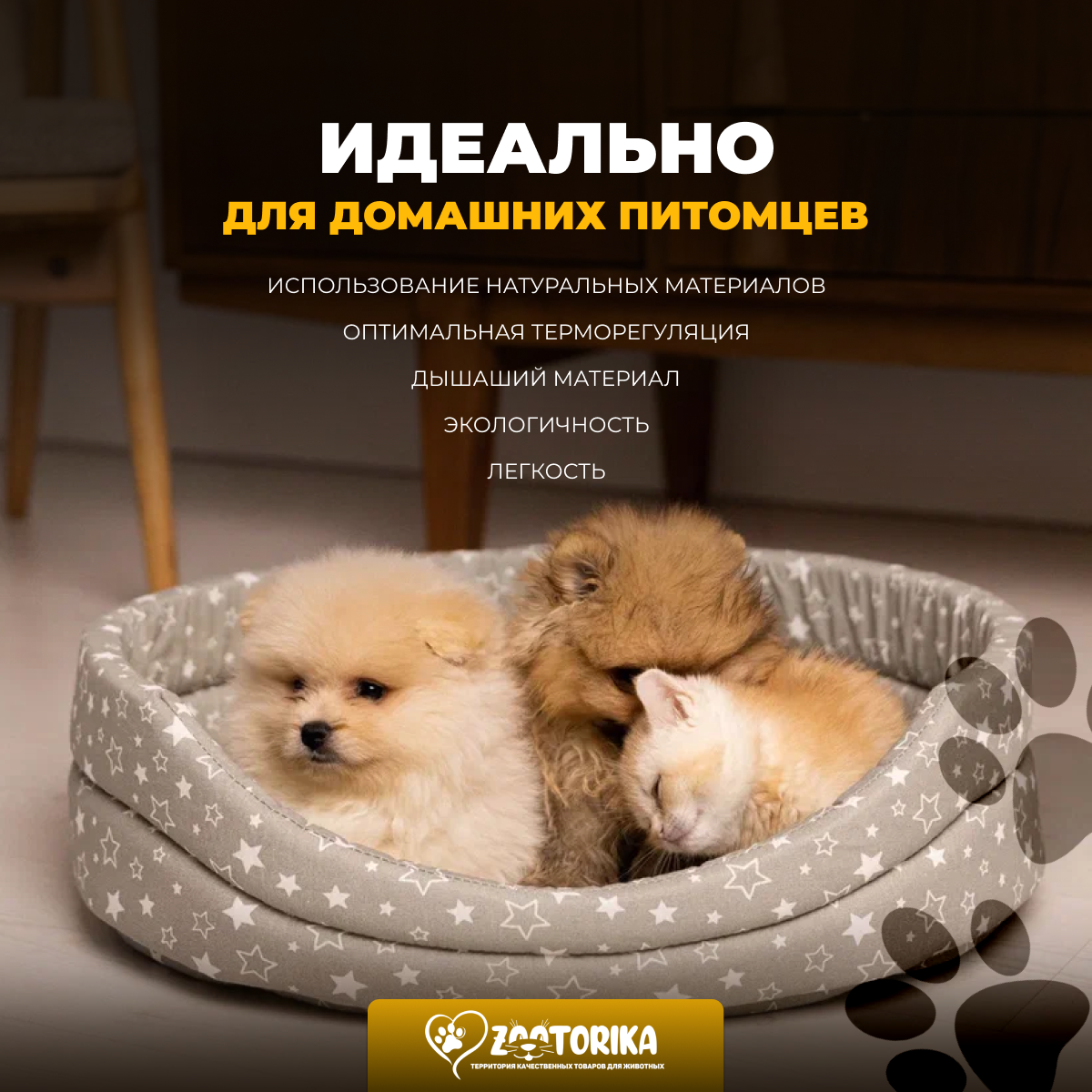 Лежанка для кошек и собак TerraBed овальная "Лапки", белая, 50х40 / Лежак для животных мелких пород