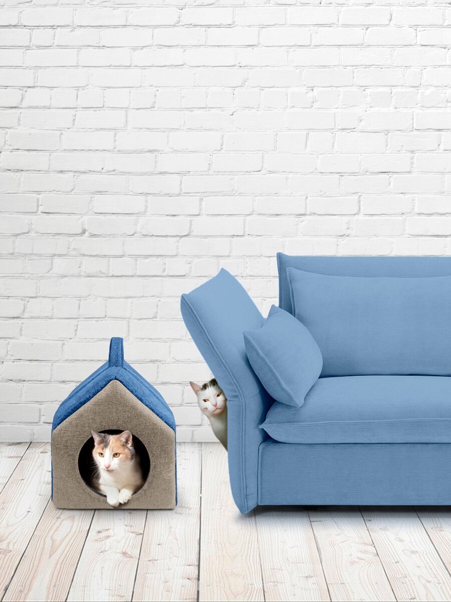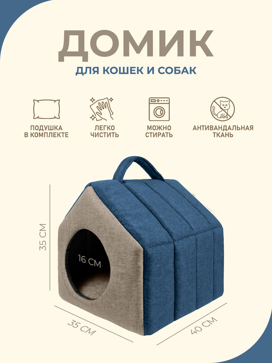 Мягкий домик для кошек, собак и животных с подушкой, 40х35х35см, серый-синий, YUGA интересное: