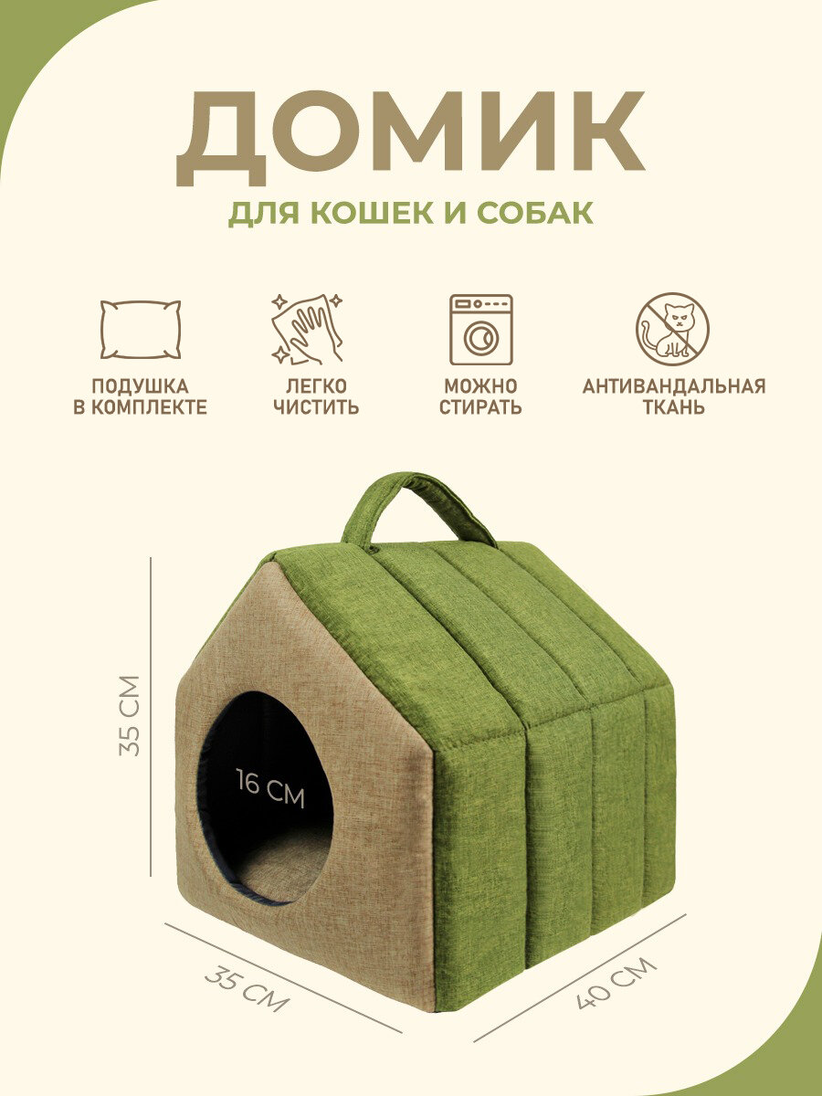 Мягкий домик для кошек, собак и животных с подушкой, 40х35х35см, оливковый, YUGA интересное: