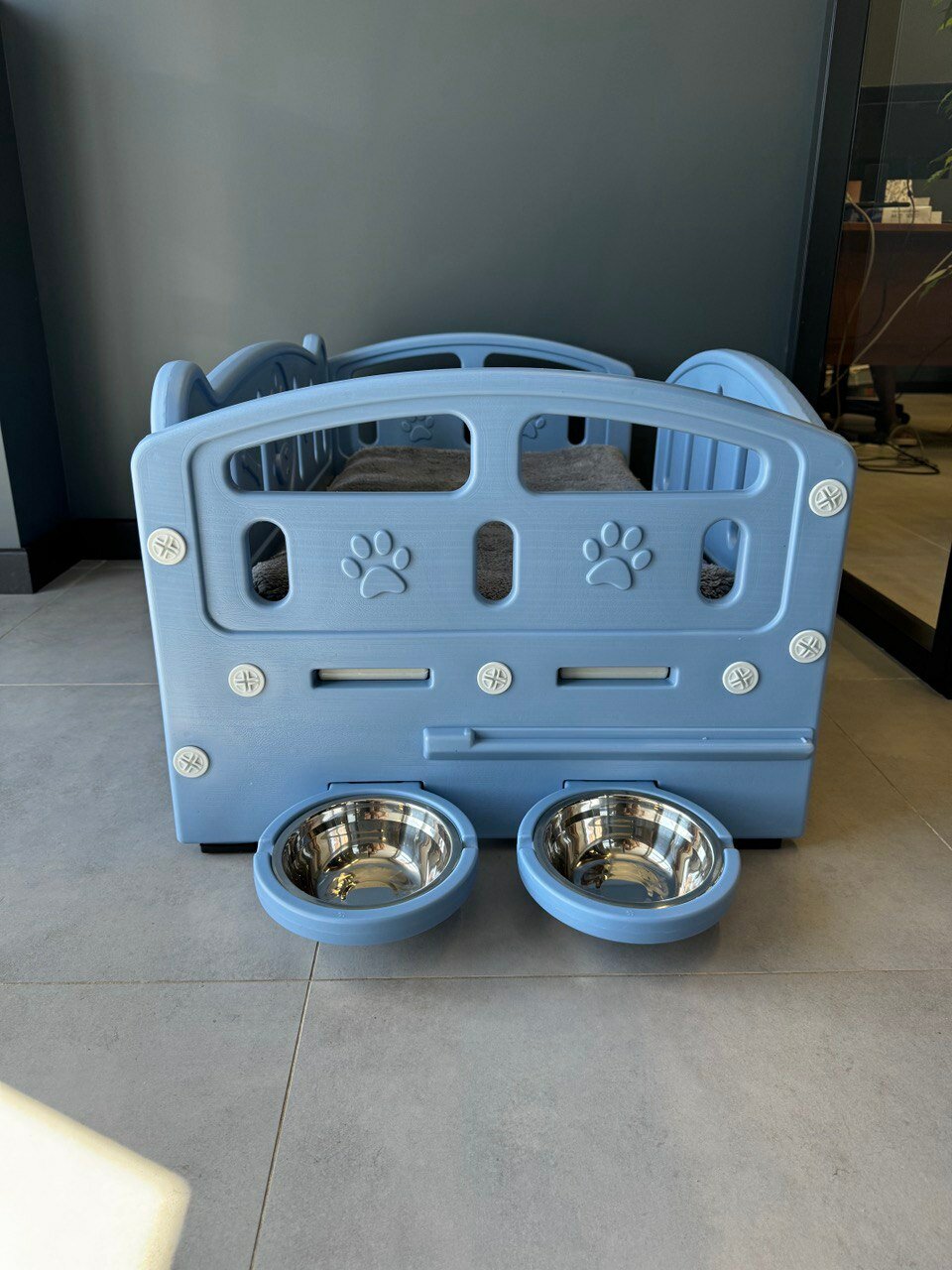 Купить Лежанка для животных с подушкой, двумя стальными мисками, ступенькой, синий 118,2x70,6x44,2