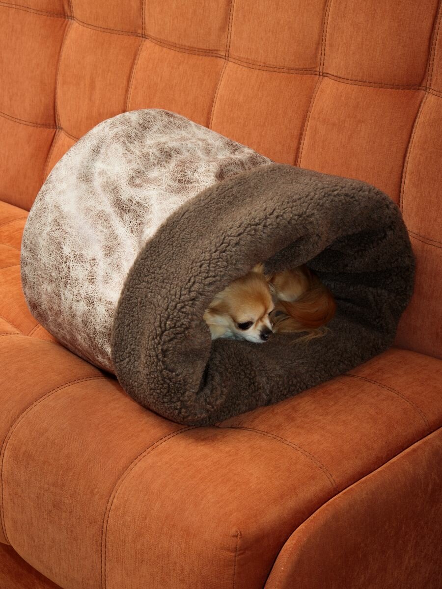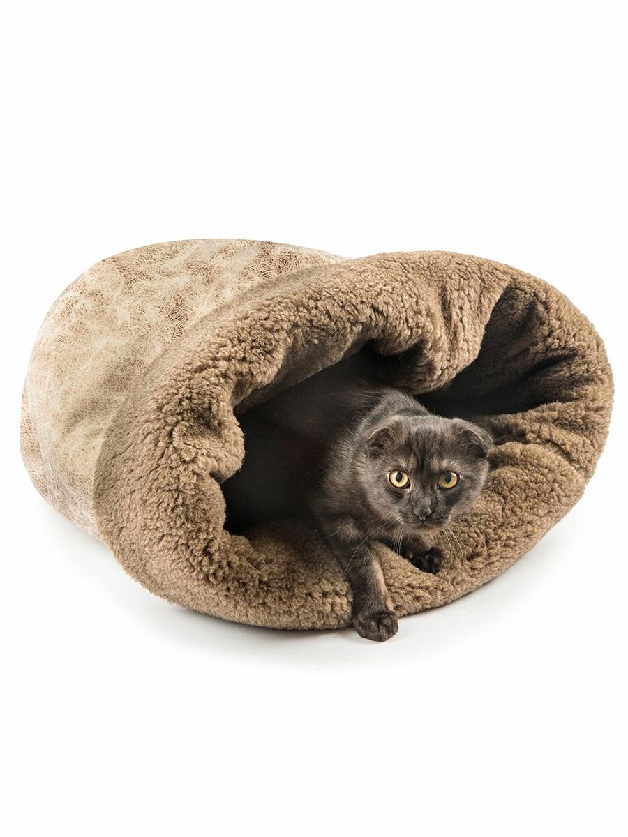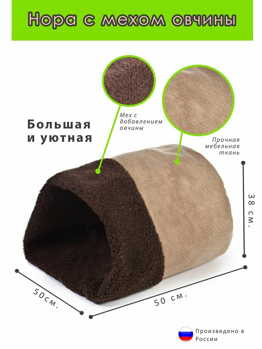 Купить Домик для кошек и собак "Нора с овчиной", тоннель, Пятница, бежевая ткань и коричневый мех, 38*50*38 см