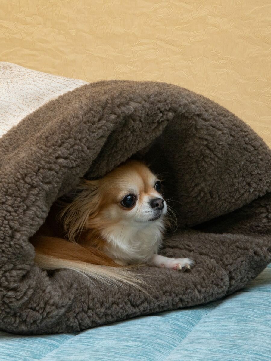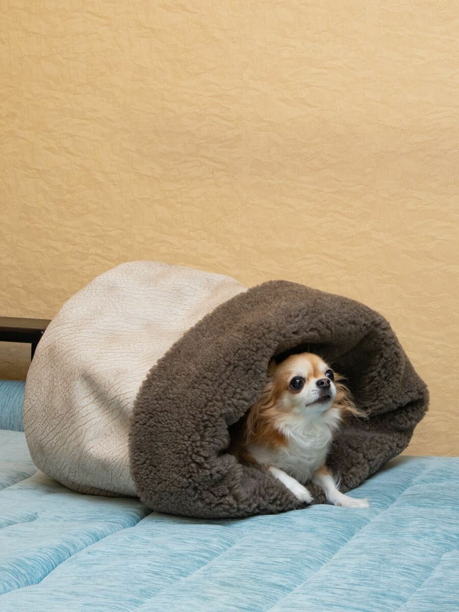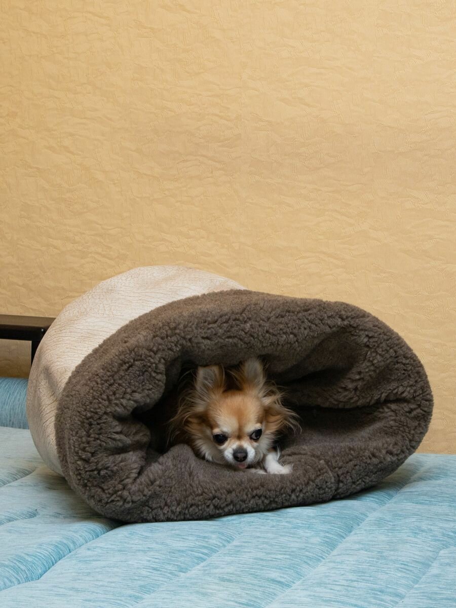 Купить Домик для кошек и собак "Нора с овчиной", тоннель, Пятница, бежевая ткань и коричневый мех, 38*50*38 см
