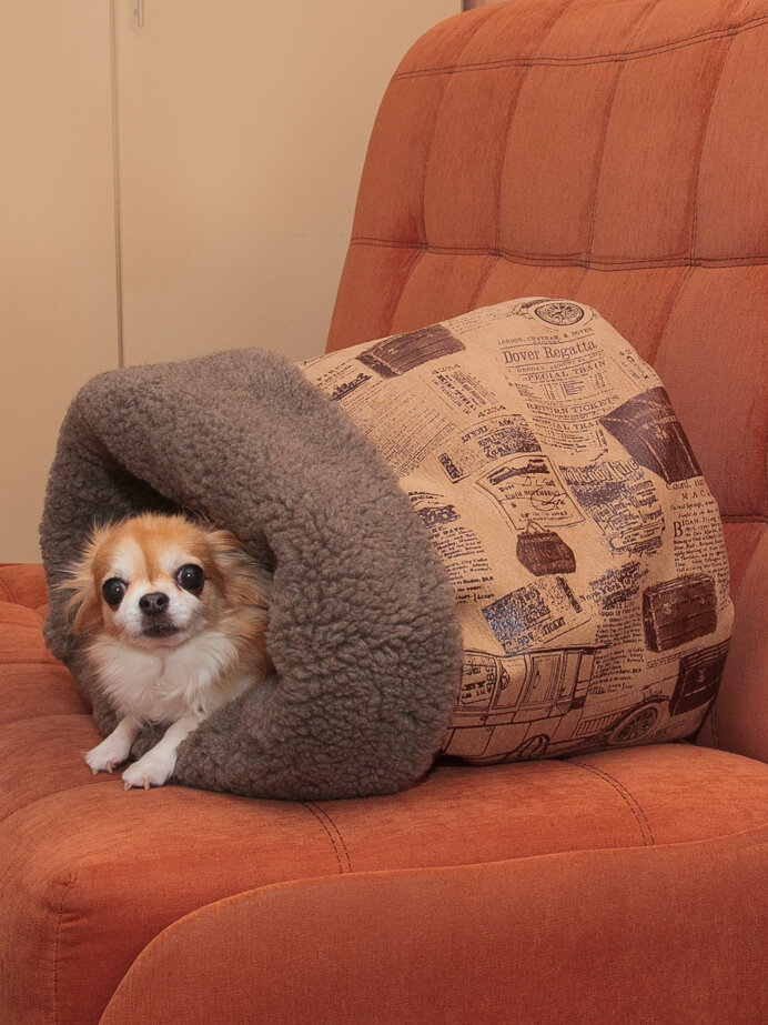 Домик для кошек и собак "Нора с овчиной", тоннель, Пятница, бежевая ткань и коричневый мех, 38*50*38 см