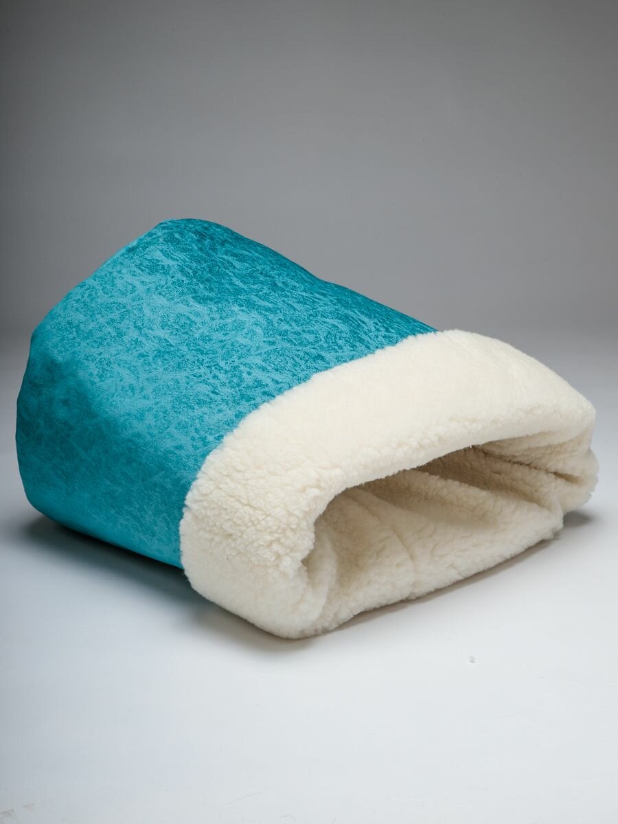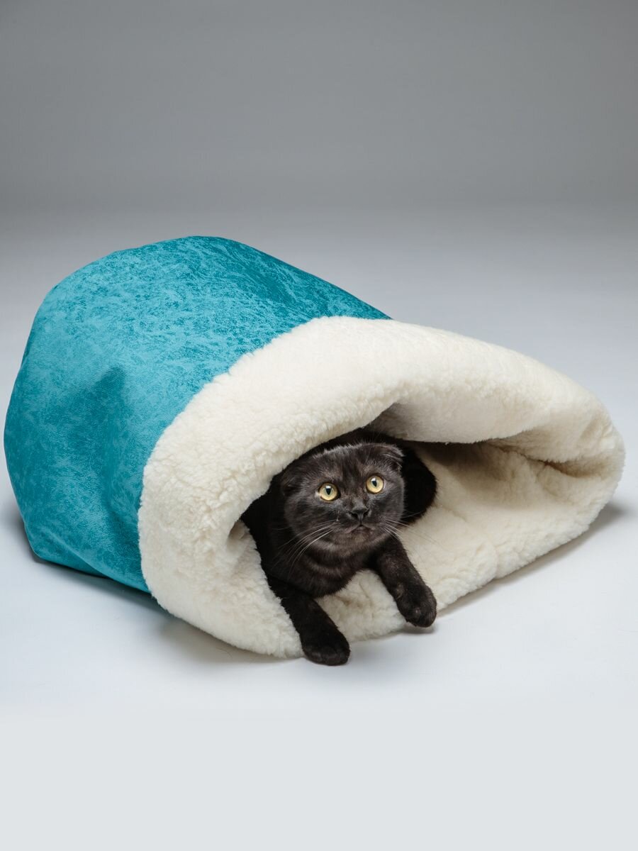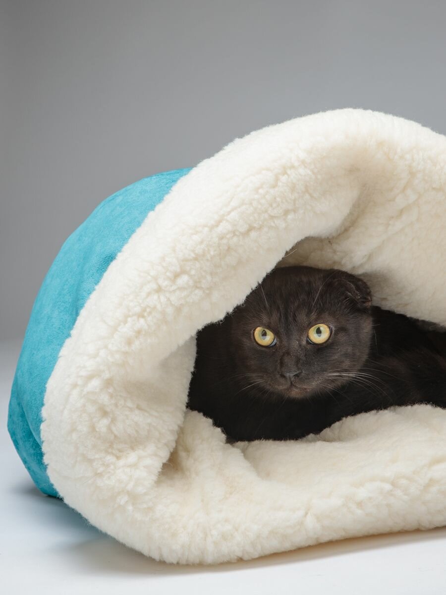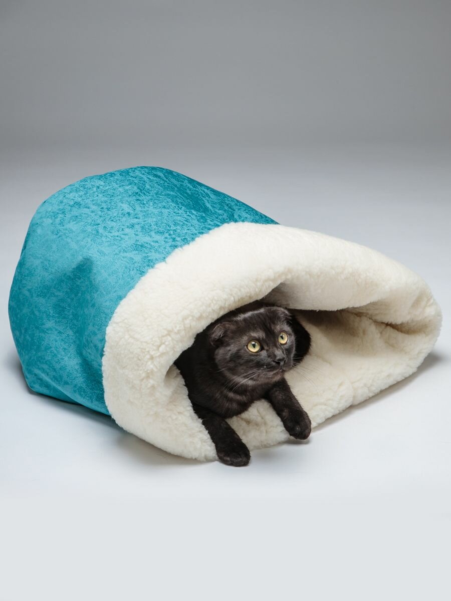 СохранитьЛежанка для кошек и собак "Нора с овчиной", Пятница. голубой велюр и молочный мех, 50*38*50 см, домик и тоннель интересное: