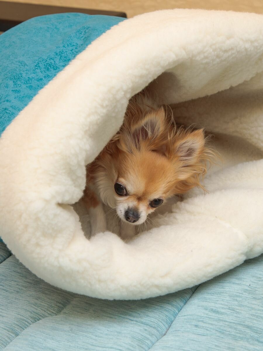 Купить Лежанка для кошек и собак "Нора с овчиной", Пятница. голубой велюр и молочный мех, 50*38*50 см, домик и тоннель