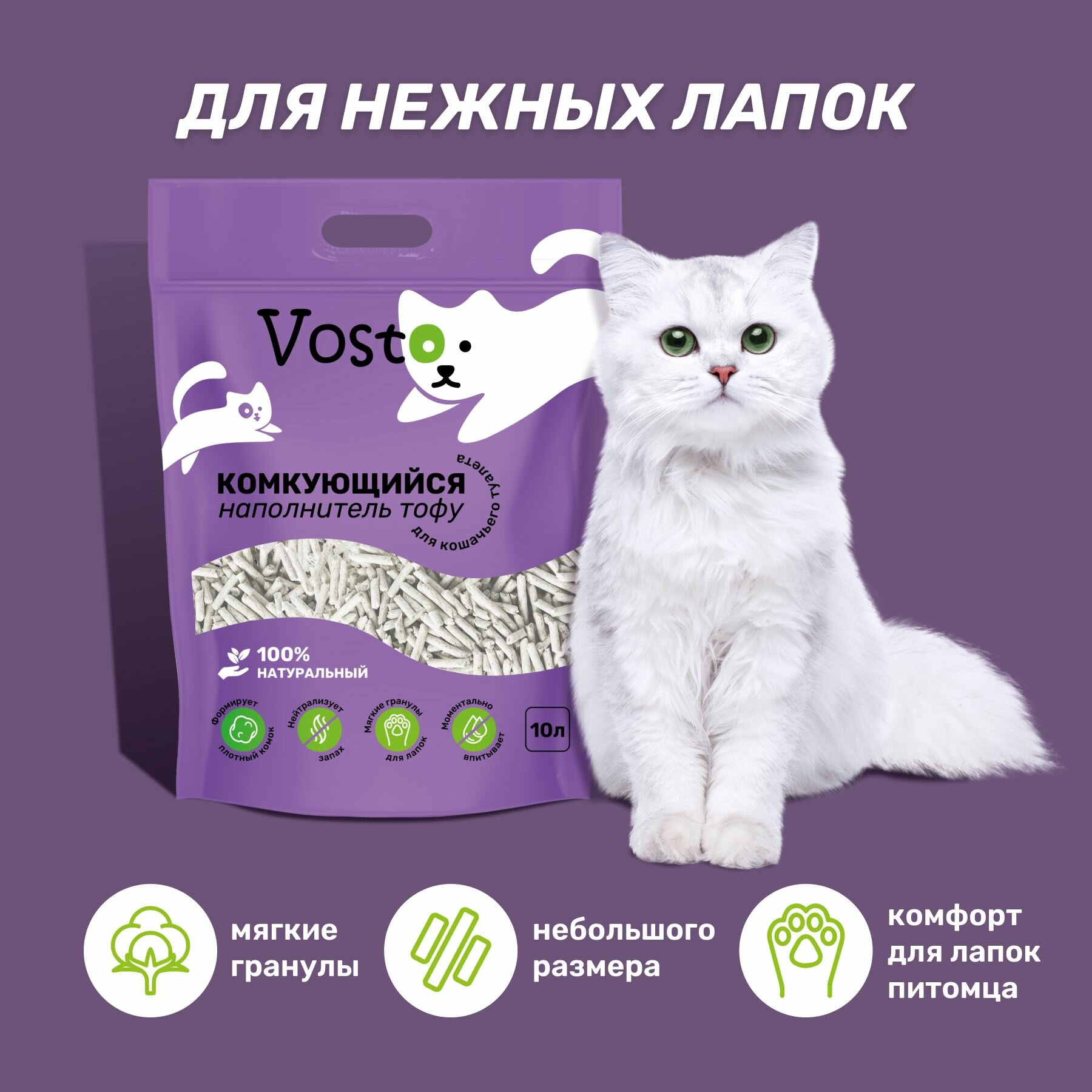 Наполнитель Vosto Тофу, для кошек, комкующийся, соевый, без пыли, 10л