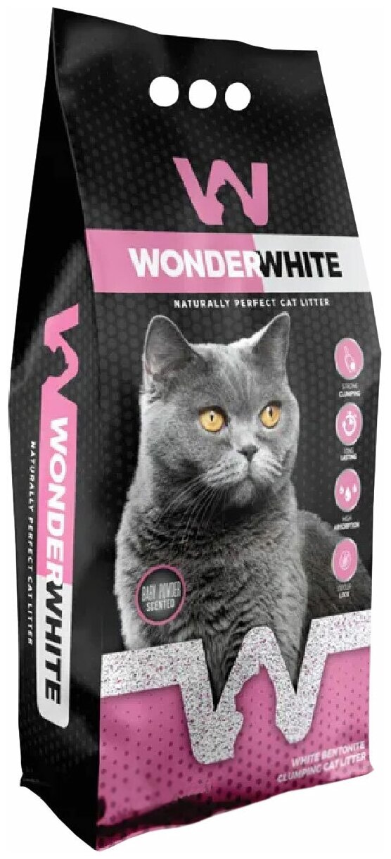 WONDER WHITE BABY POWDER наполнитель комкующийся для туалета кошек с ароматом детской присыпки (15,3 кг)