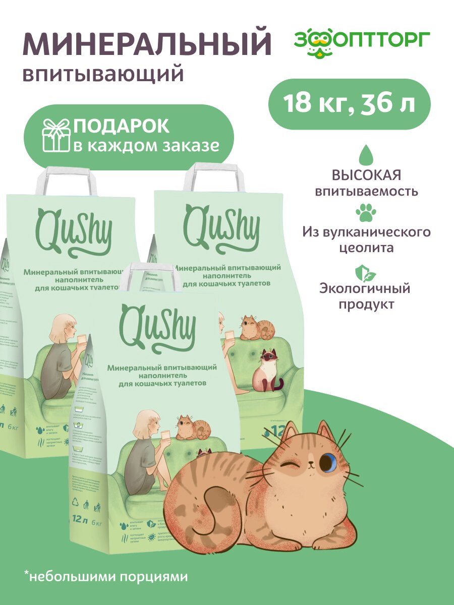 Qushy наполнитель минеральный впитывающий 18 кг, 36 л. упаковка 3 шт по 6 кг, 12 л. интересное: