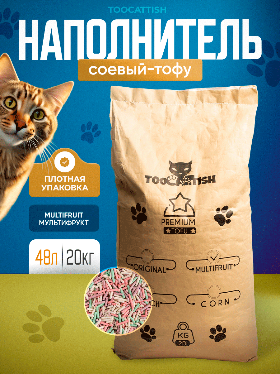 СохранитьНаполнитель для кошачьего туалета, TOOCATTISH, Мультифрукт, 20 кг, 48 л, тофу, комкующийся, соевый, смываемый интересное: