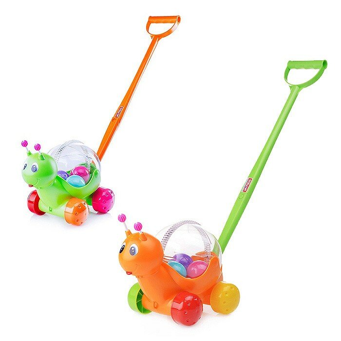 | Минусы: | Неудобно, что ручка не закреплена у основания улитки- когда ребенок хочет переставить её она отгибается вниз и чтобы поставить улитку обратно на колесики, приходится ещё выше её поднимать |