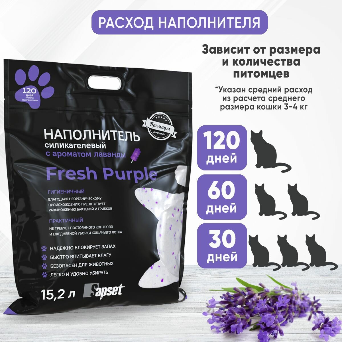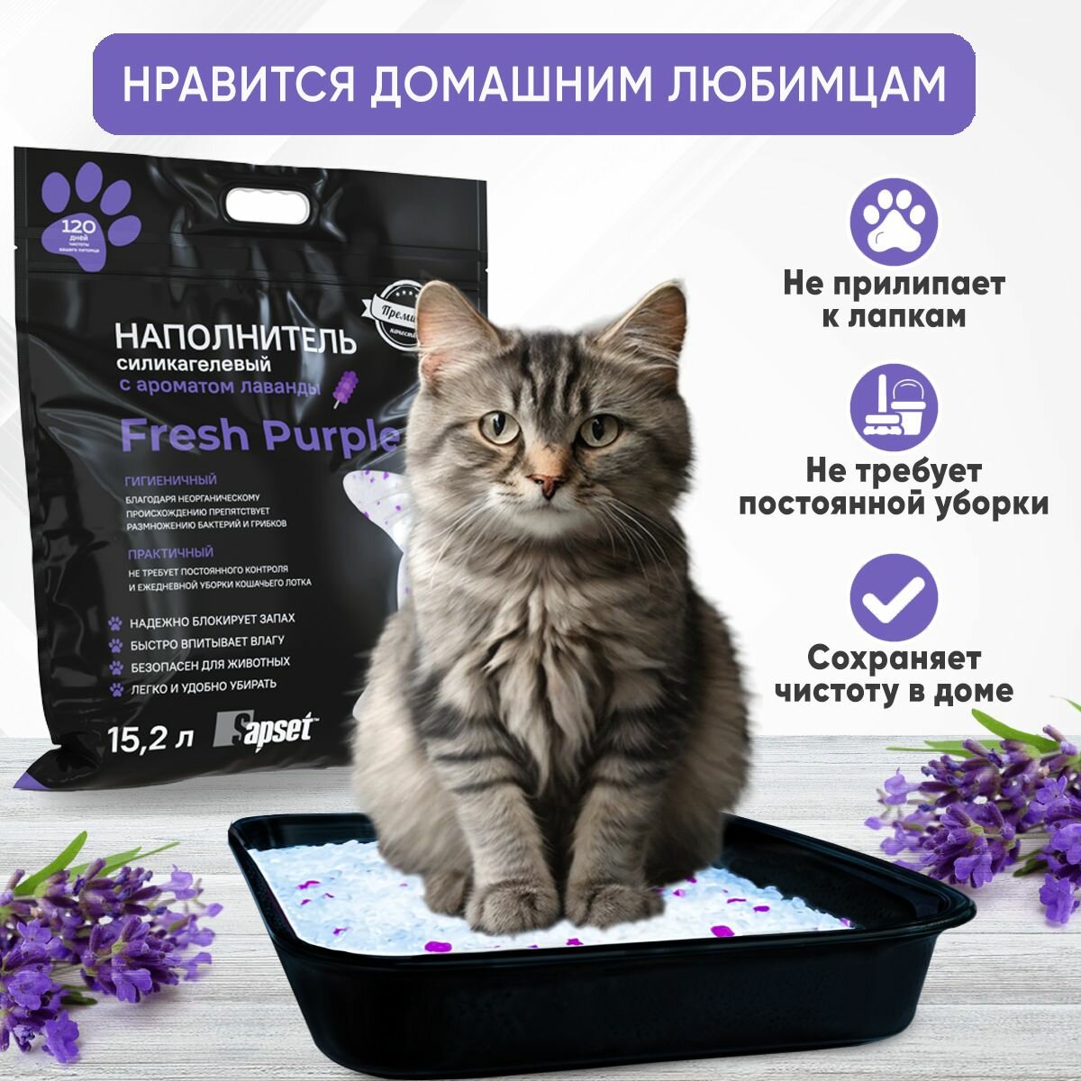 Наполнитель для кошачьего туалета Sapset Fresh Purple силикагелевый, с ароматом лаванды, 15,2л интересное: