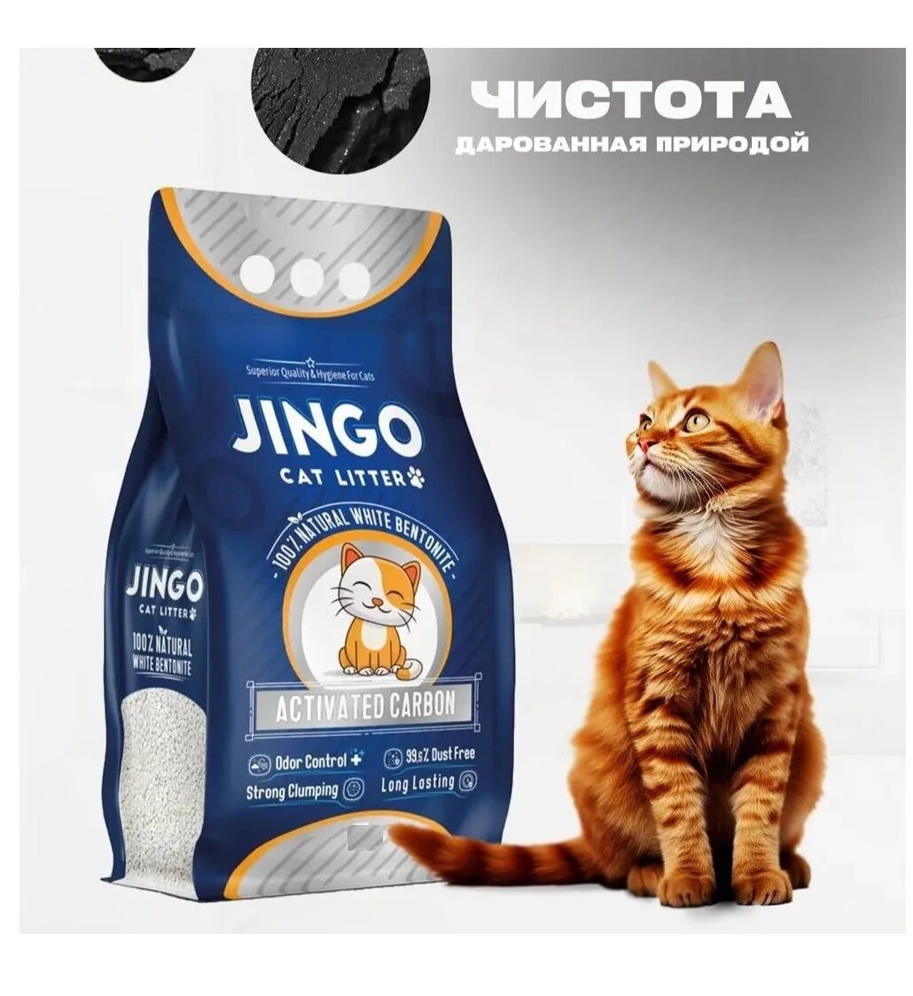 Бентонитовый комкующийся наполнитель для кошек JINGO Активированный уголь, 20л/ 17,2 кг.